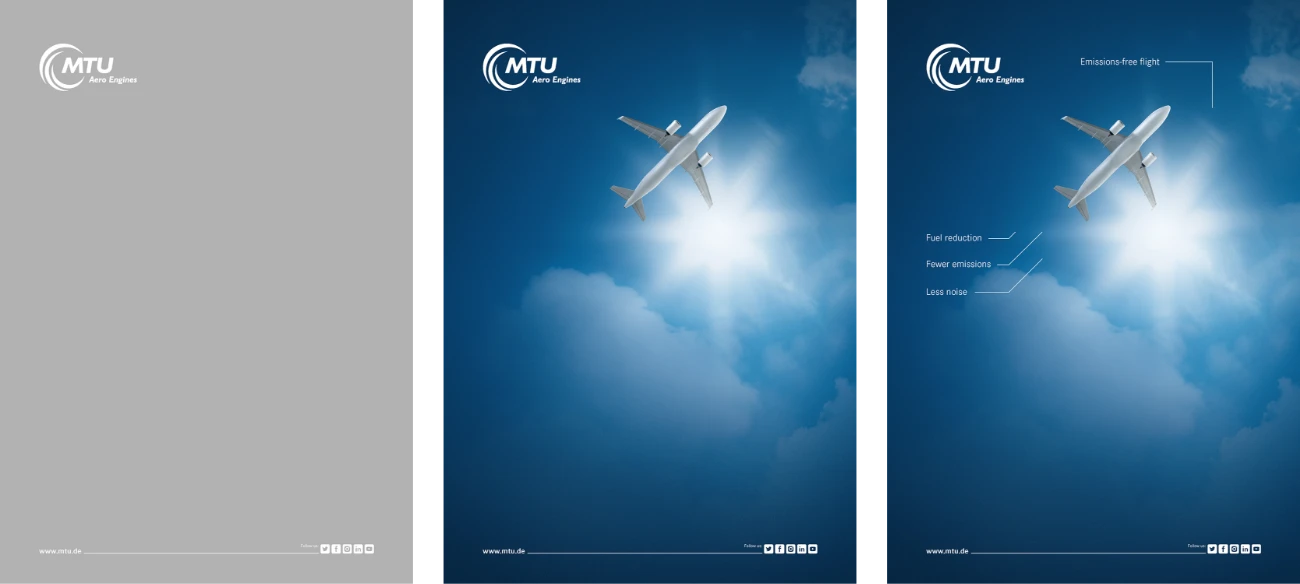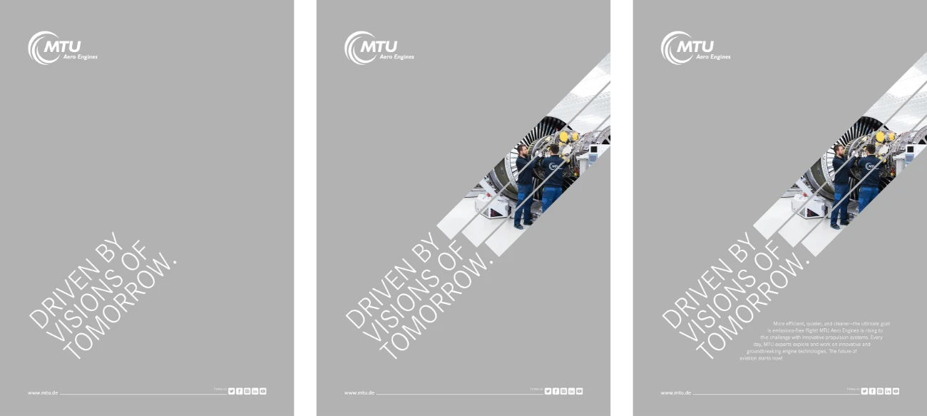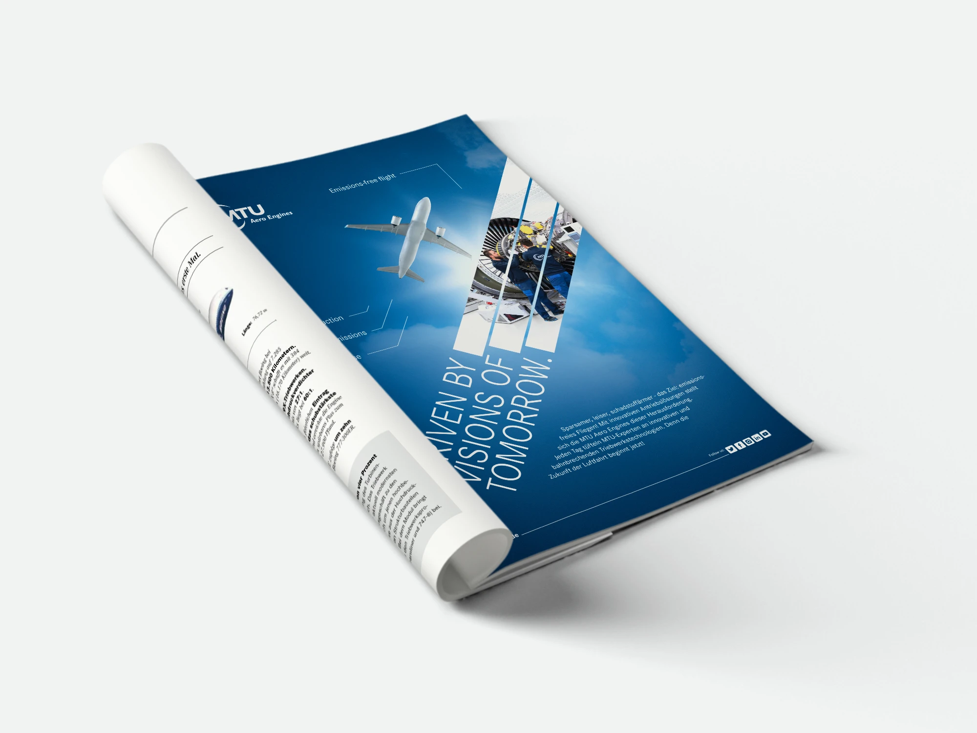 Generell vermittelt die Anzeige einen ruhigen Eindruck, um auch in der bildlichen Darstellung Souveränität auszustrahlen und MTU als wichtigen und kompetenten Partner in der Luftfahrtbranche, der sich stets für die Weiterentwicklung neuer Antriebstechnologien einsetzt, zu positionieren.