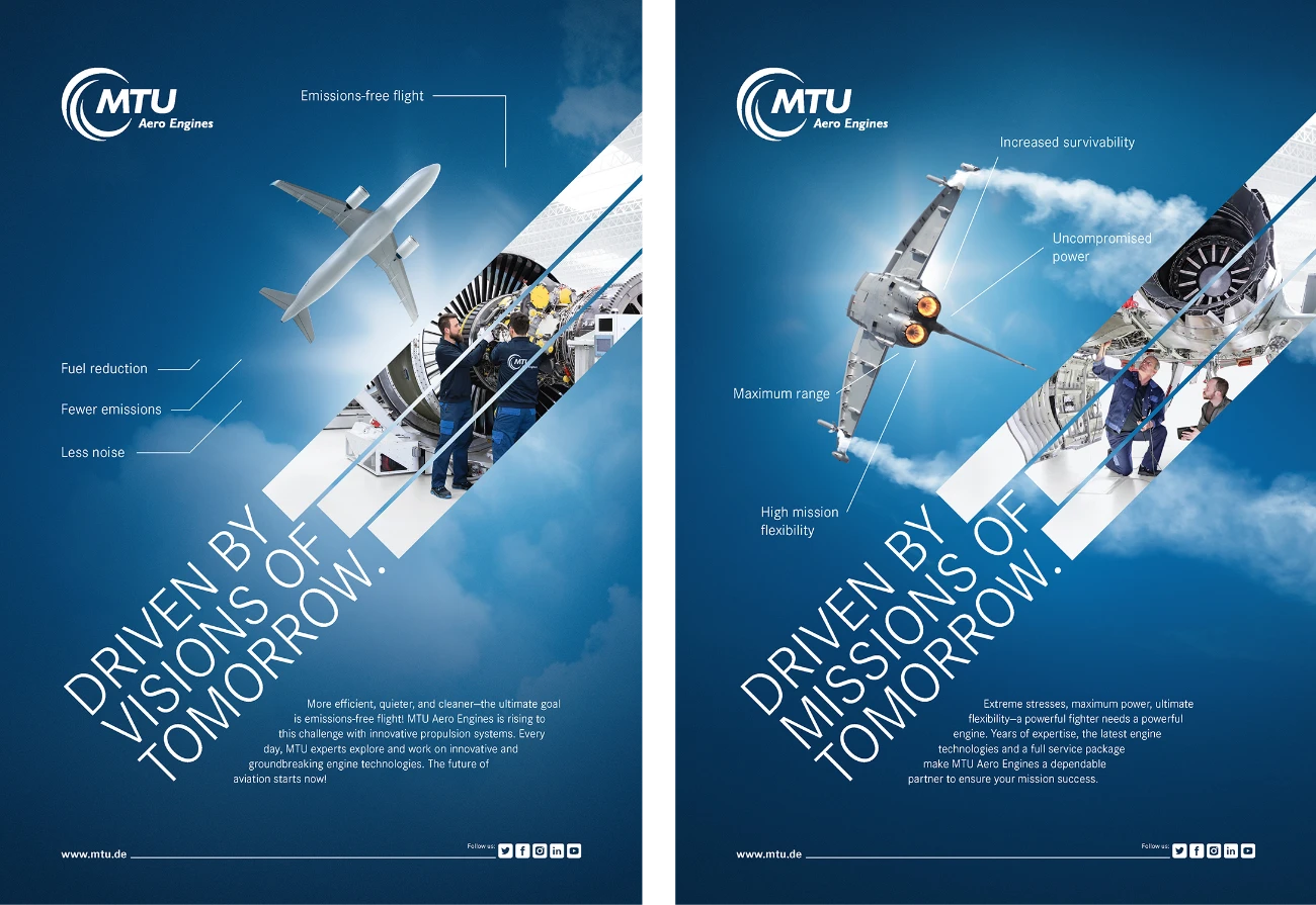in ÜberarbeitungIm Rahmen der crossmedialen Kommunikation der MTU Aero Engines bieten Anzeigen die Möglichkeit, eine sehr breite Zielgruppe zu erreichen. Ziel der Imagekampagnen ist es, das Unternehmen national und international als innovativen und serviceorientierten Partner zu präsentieren und insbesondere in neuen Märkten den Bekanntheitsgrad des Unternehmens zu steigern. Visuell attraktiv gestaltete Anzeigenmotive und textlich exzellent umgesetzte Inhalte wecken Aufmerksamkeit.