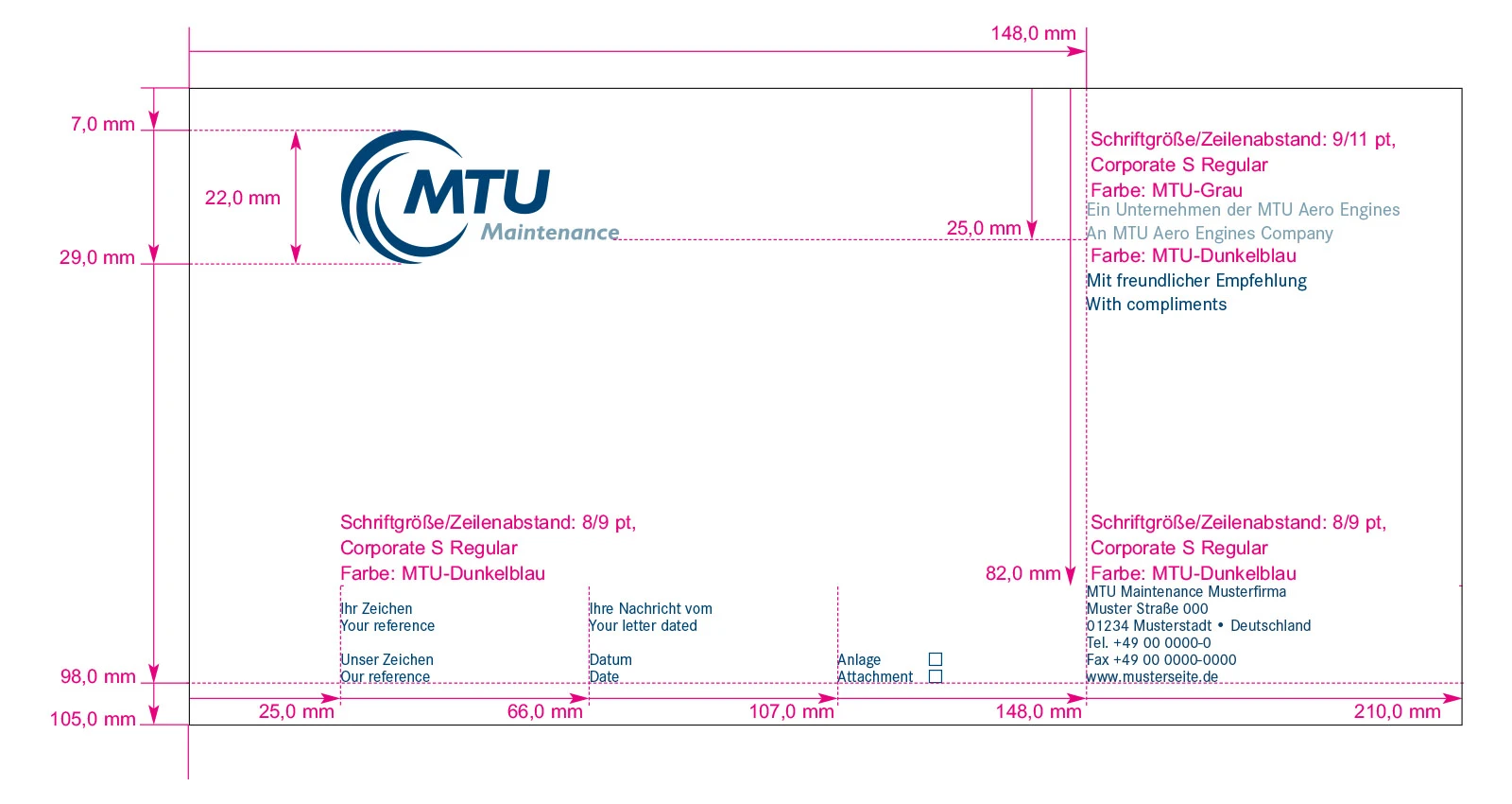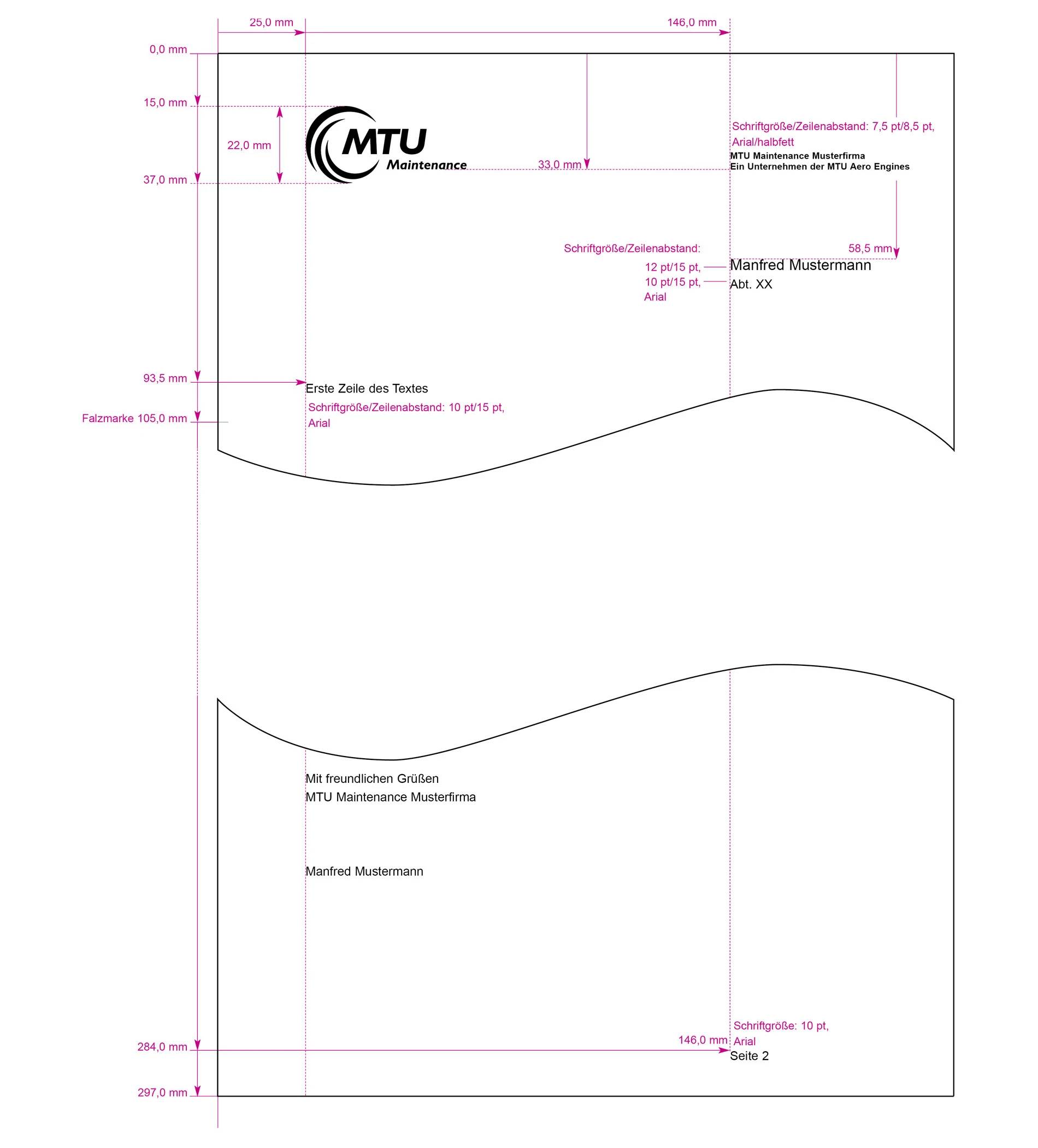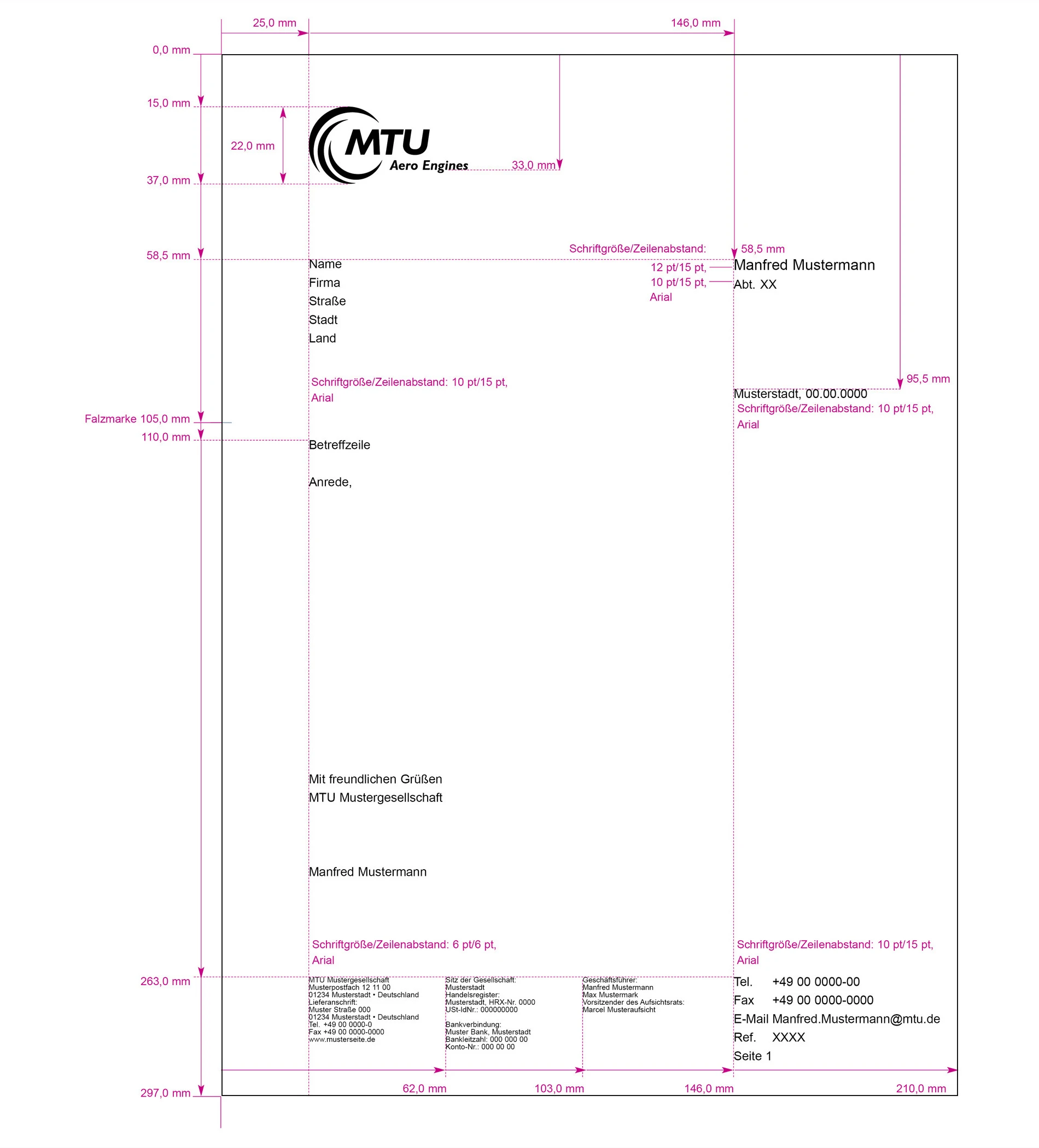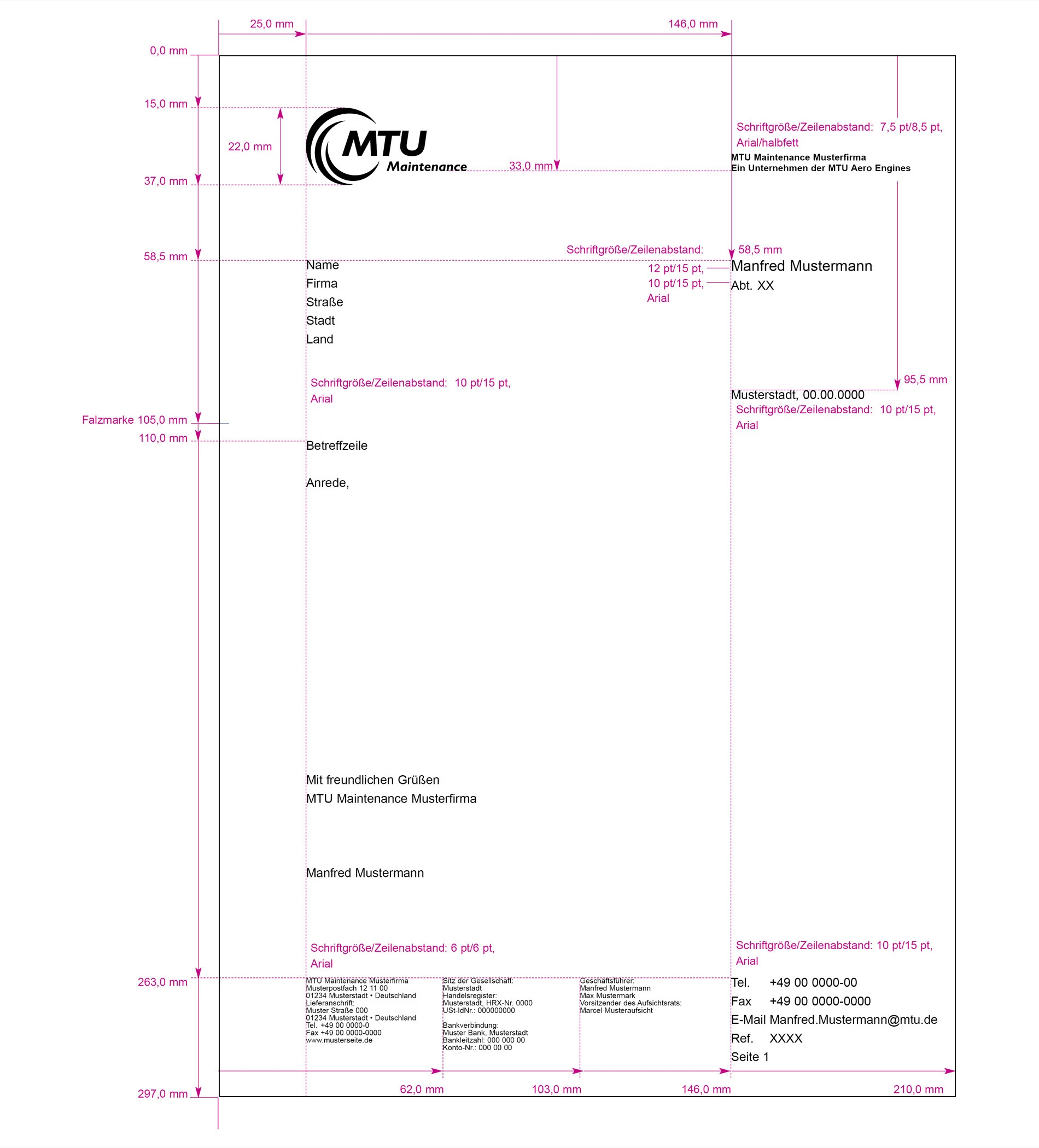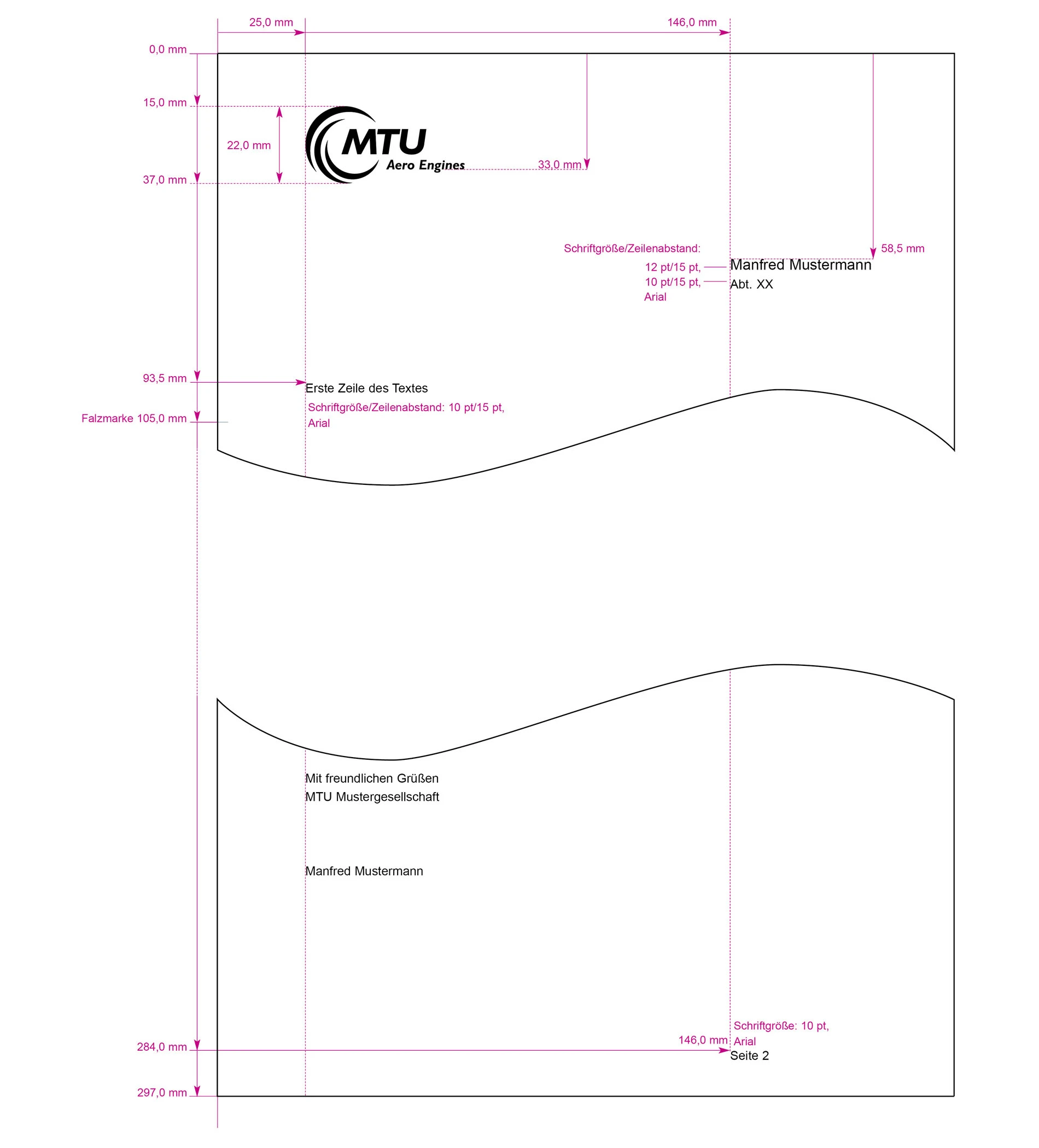 in ÜberarbeitungGeschäftspapiere sind ein wesentlicher Bestandteil unserer Kommunikation, da diese weit verbreitet und häufig eingesetzt werden. Durch das Layout unserer Geschäftspapiere wird ein bestimmtes, von der MTU Aero Engines beabsichtigtes Image kommuniziert. Genauso wichtig ist jedoch der Inhalt, der von jedem Einzelnen in einen Brief, eine Mitteilung oder ein Formular eingebracht wird sowie der Zustand der Geschäftspapiere, wenn sie den Empfänger erreichen. Schlecht formulierte Schreiben oder nachlässig gefaltete Briefbogen beeinträchtigen den Eindruck der Präzision und Effizienz, den wir vermitteln wollen. Der beste Eindruck entsteht aus der Summe aller korrekt eingesetzten Details.