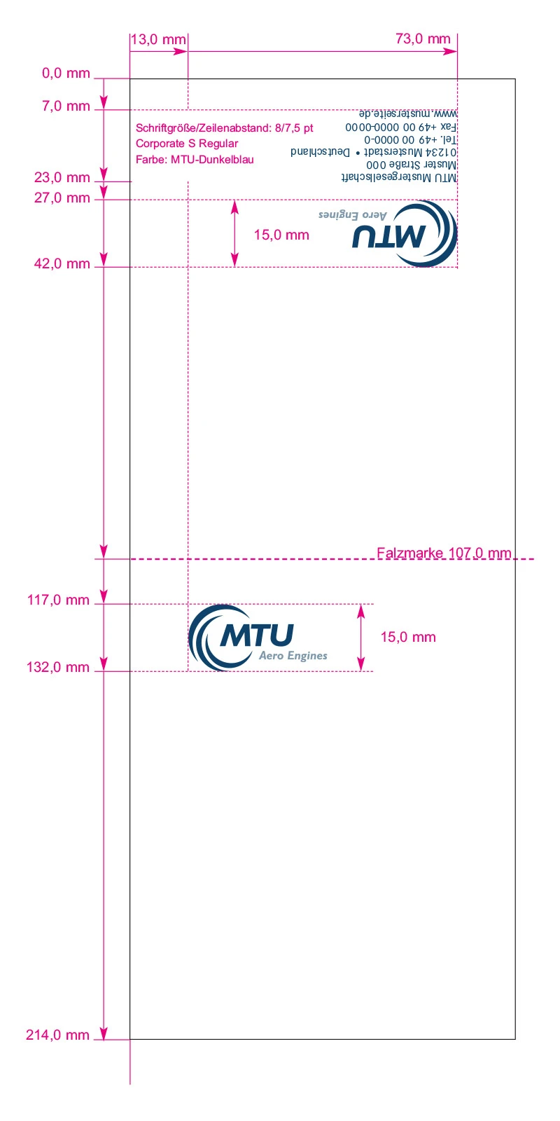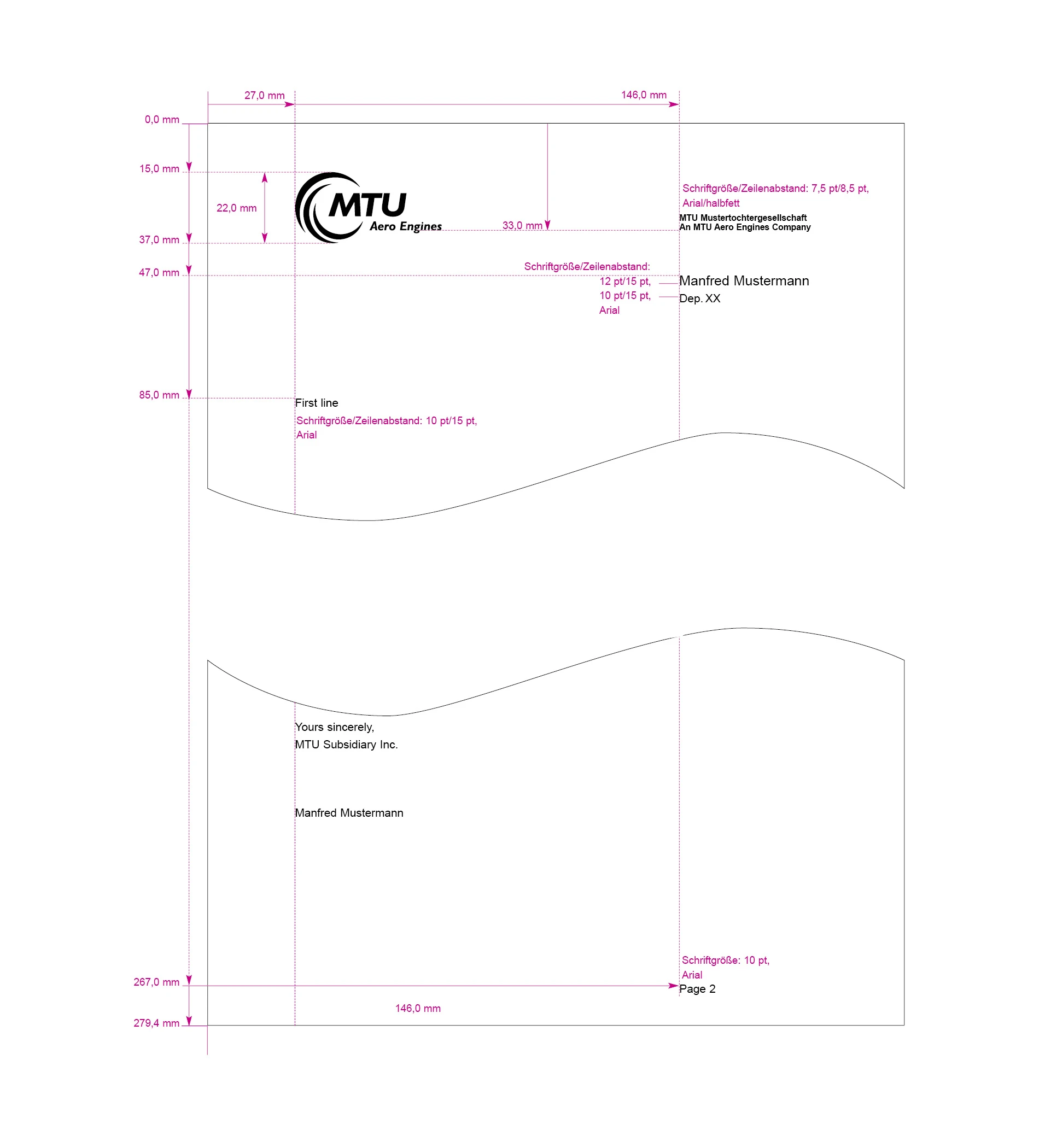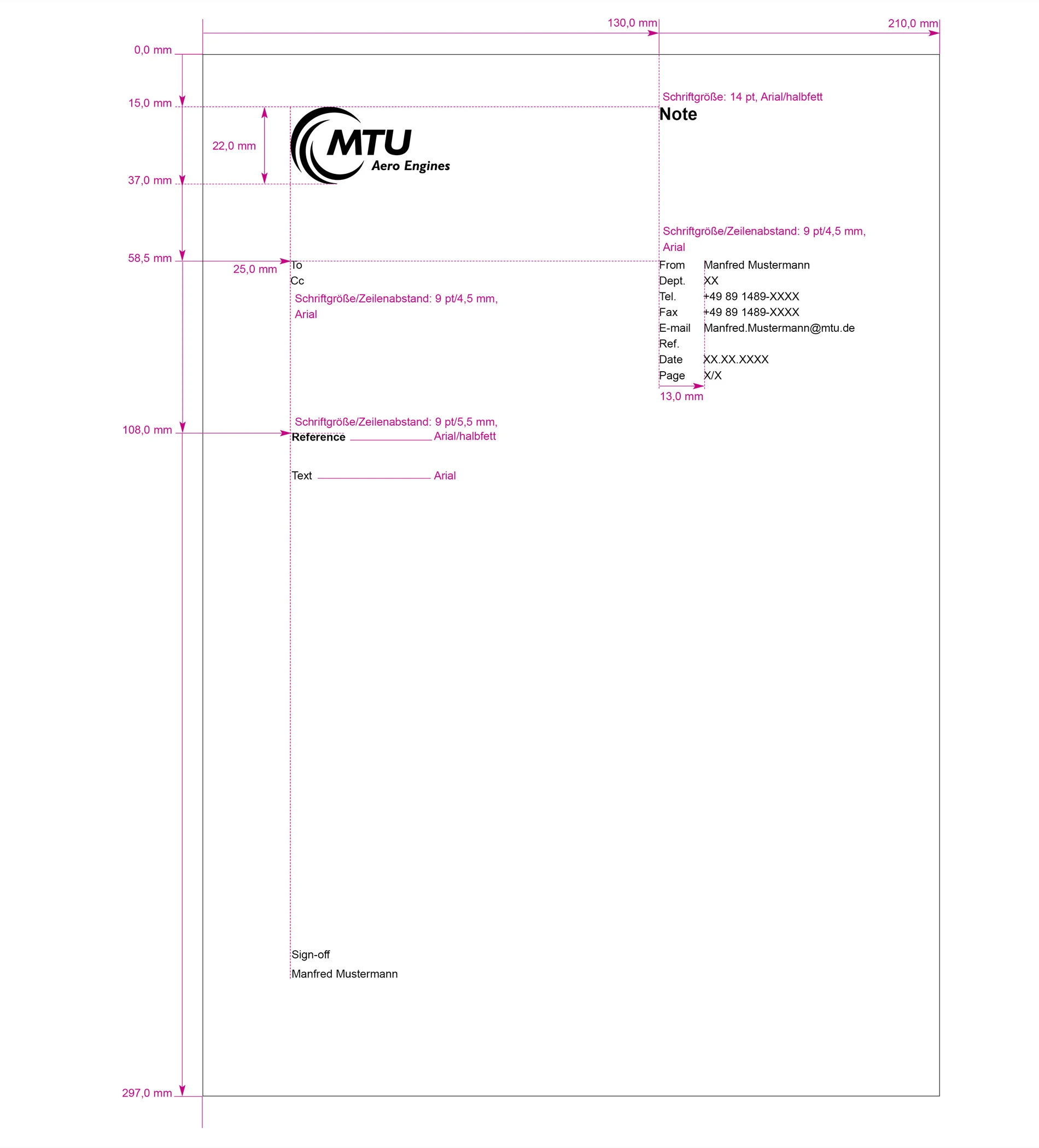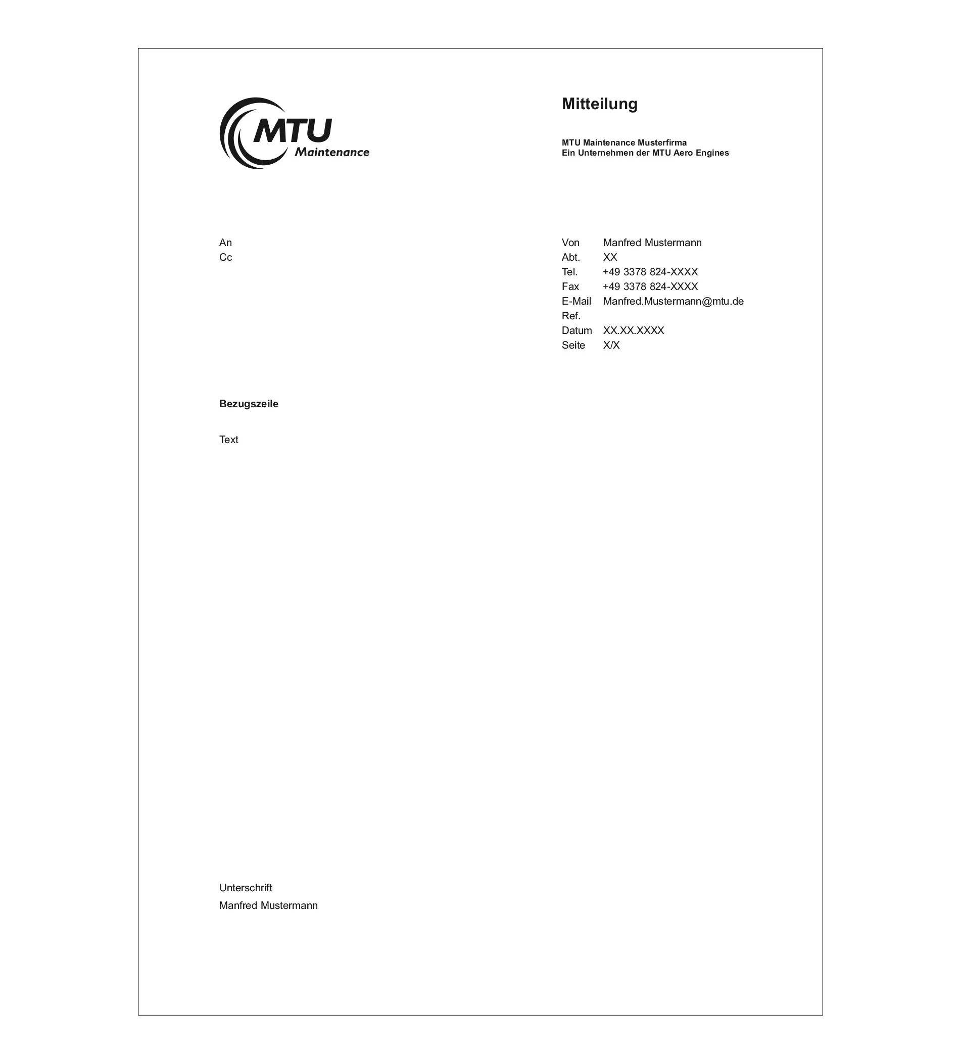 in ÜberarbeitungGeschäftspapiere sind ein wesentlicher Bestandteil unserer Kommunikation, da diese weit verbreitet und häufig eingesetzt werden. Durch das Layout unserer Geschäftspapiere wird ein bestimmtes, von der MTU Aero Engines beabsichtigtes Image kommuniziert. Genauso wichtig ist jedoch der Inhalt, der von jedem Einzelnen in einen Brief, eine Mitteilung oder ein Formular eingebracht wird sowie der Zustand der Geschäftspapiere, wenn sie den Empfänger erreichen. Schlecht formulierte Schreiben oder nachlässig gefaltete Briefbogen beeinträchtigen den Eindruck der Präzision und Effizienz, den wir vermitteln wollen. Der beste Eindruck entsteht aus der Summe aller korrekt eingesetzten Details.