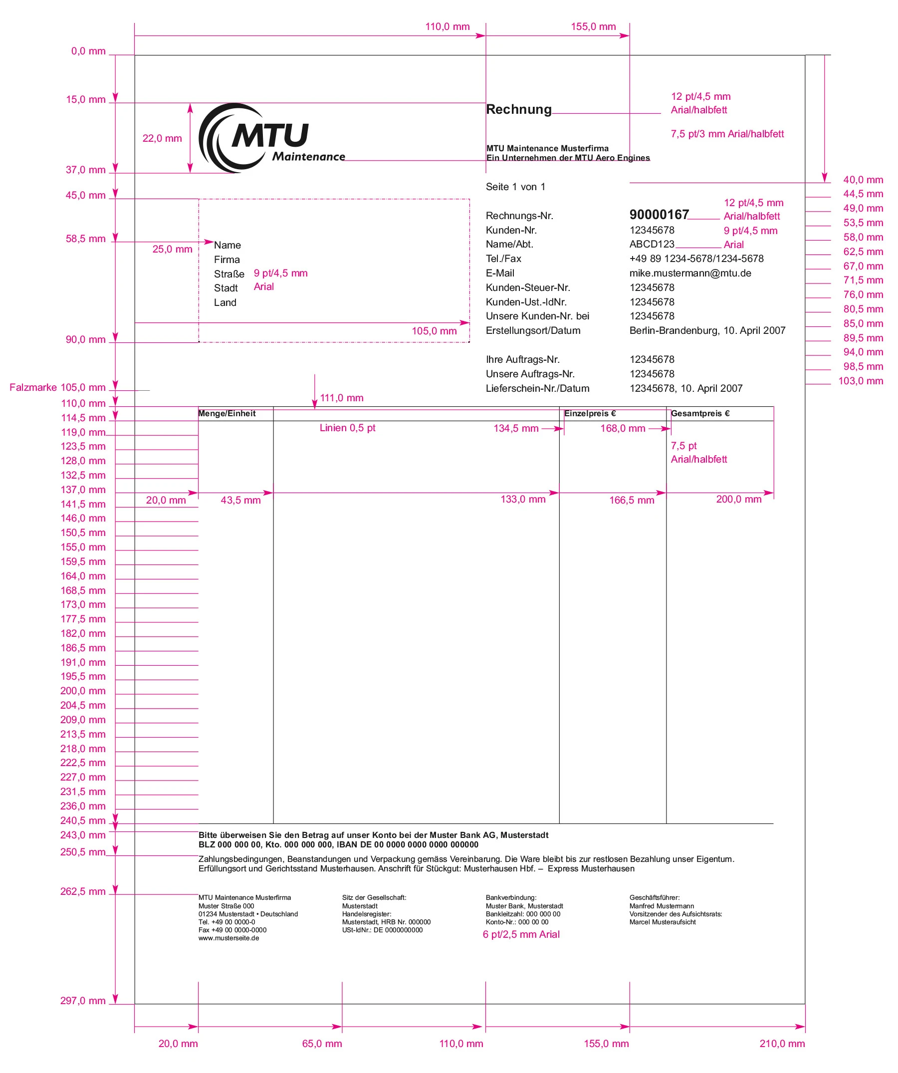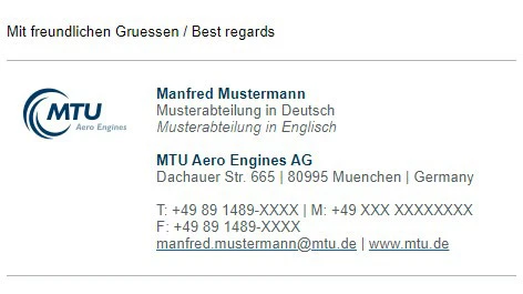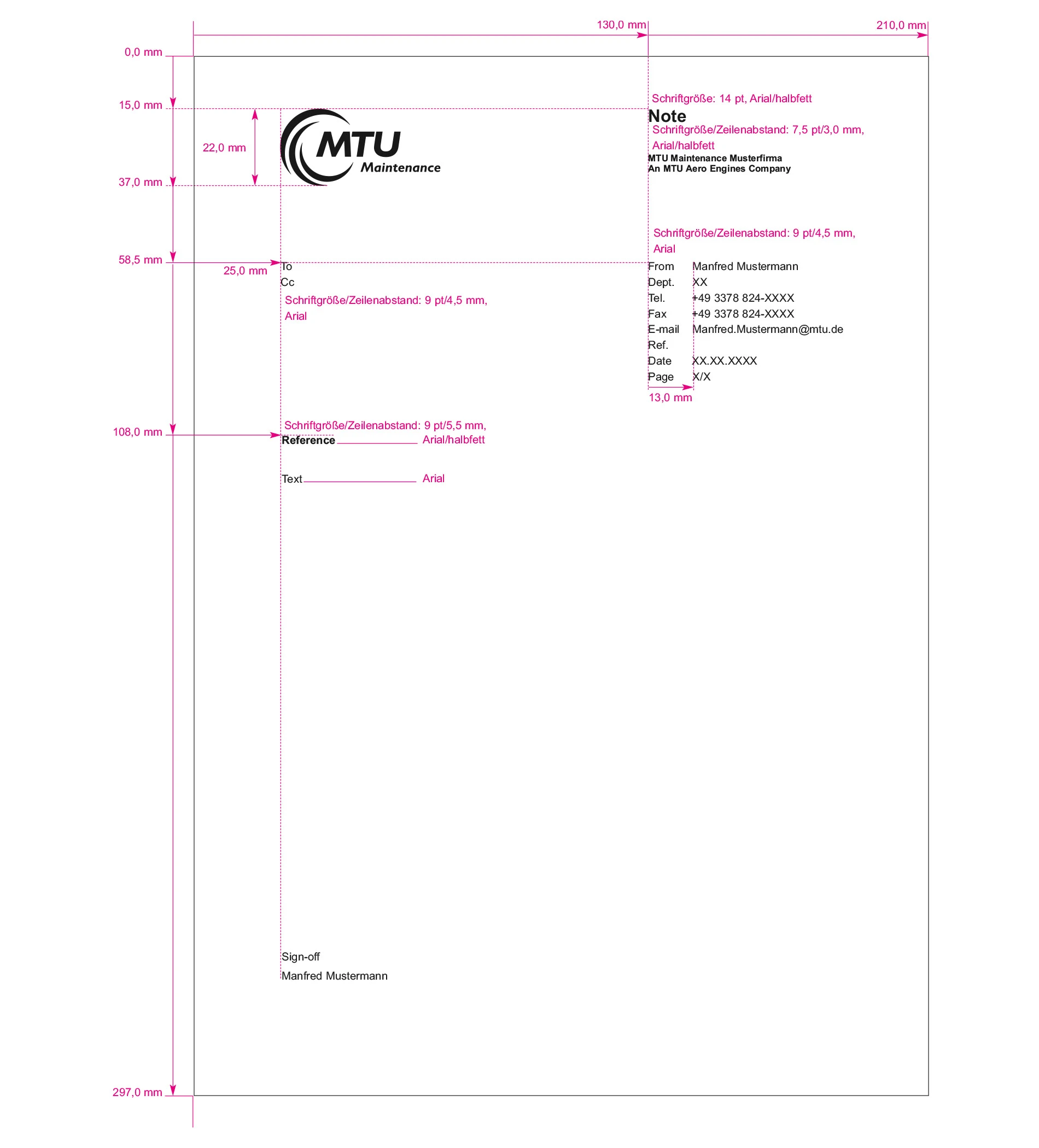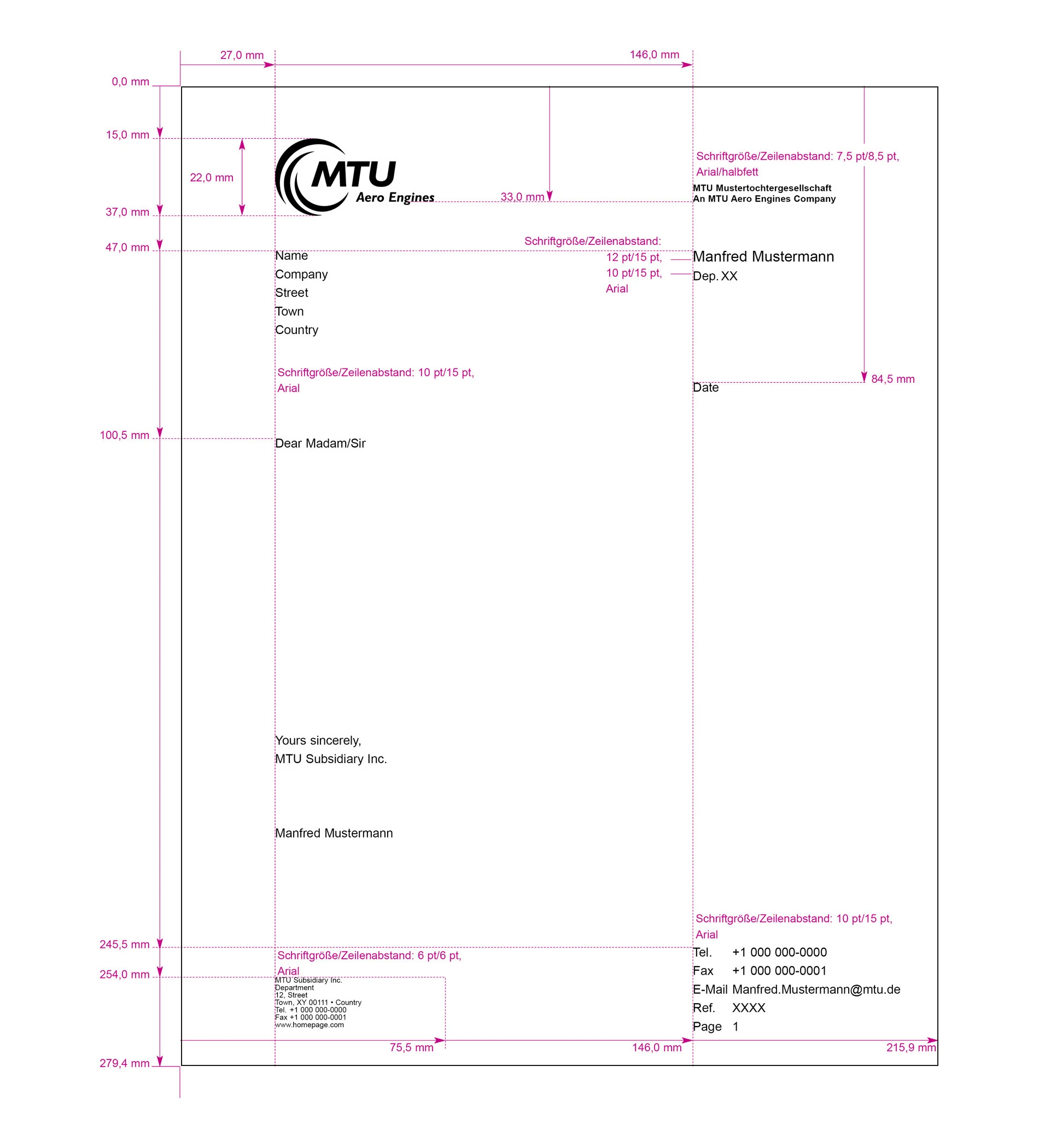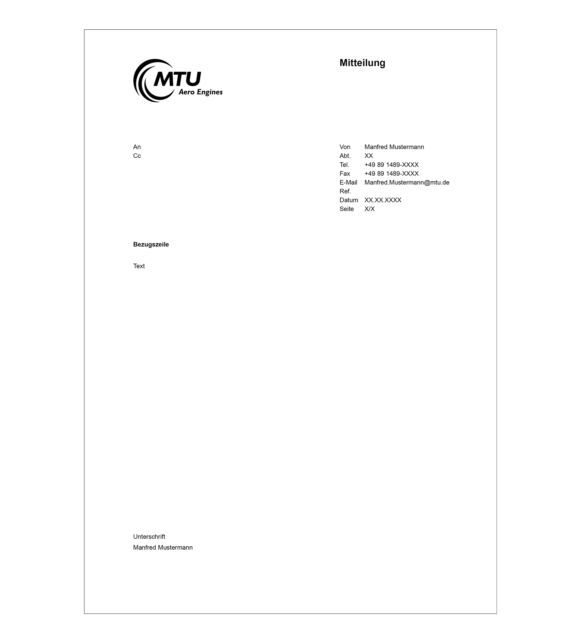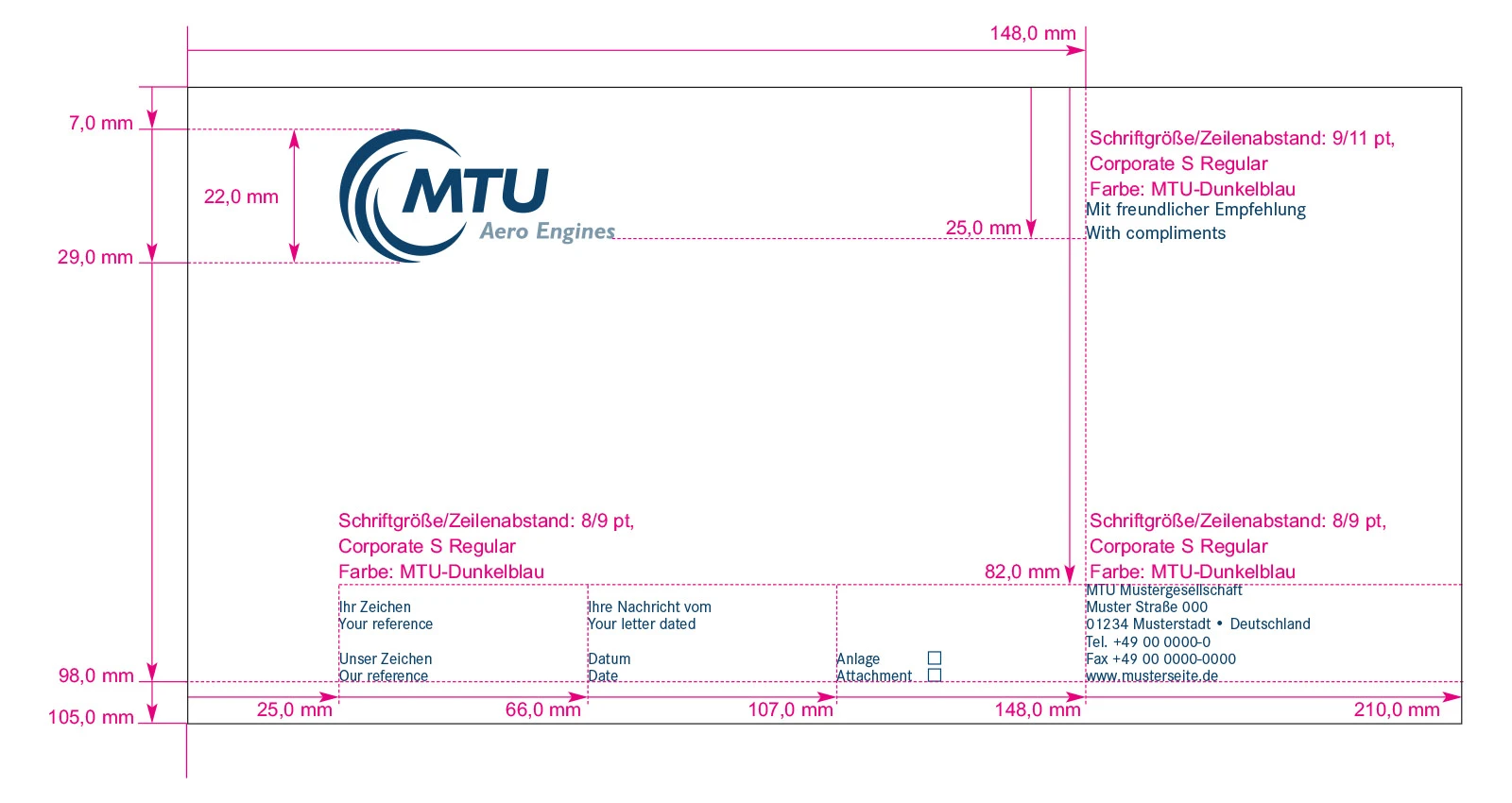 in ÜberarbeitungGeschäftspapiere sind ein wesentlicher Bestandteil unserer Kommunikation, da diese weit verbreitet und häufig eingesetzt werden. Durch das Layout unserer Geschäftspapiere wird ein bestimmtes, von der MTU Aero Engines beabsichtigtes Image kommuniziert. Genauso wichtig ist jedoch der Inhalt, der von jedem Einzelnen in einen Brief, eine Mitteilung oder ein Formular eingebracht wird sowie der Zustand der Geschäftspapiere, wenn sie den Empfänger erreichen. Schlecht formulierte Schreiben oder nachlässig gefaltete Briefbogen beeinträchtigen den Eindruck der Präzision und Effizienz, den wir vermitteln wollen. Der beste Eindruck entsteht aus der Summe aller korrekt eingesetzten Details.