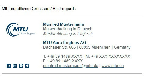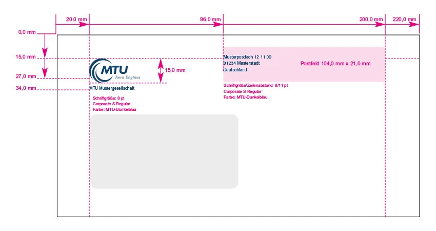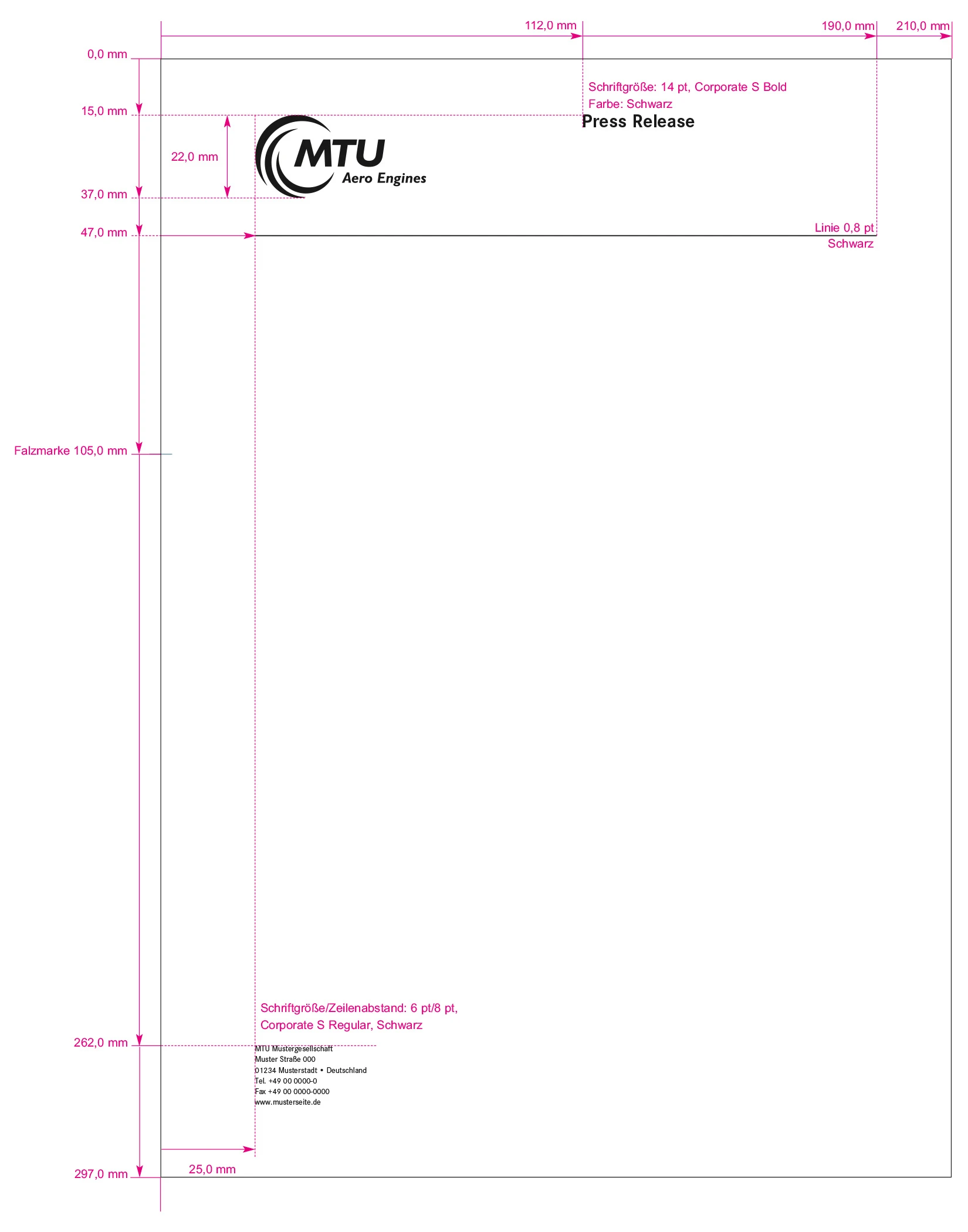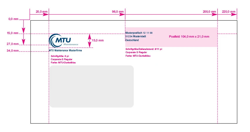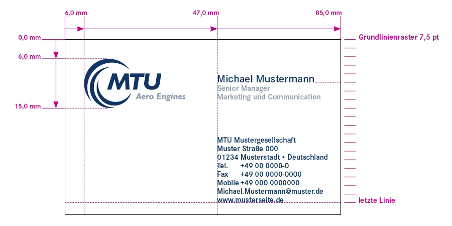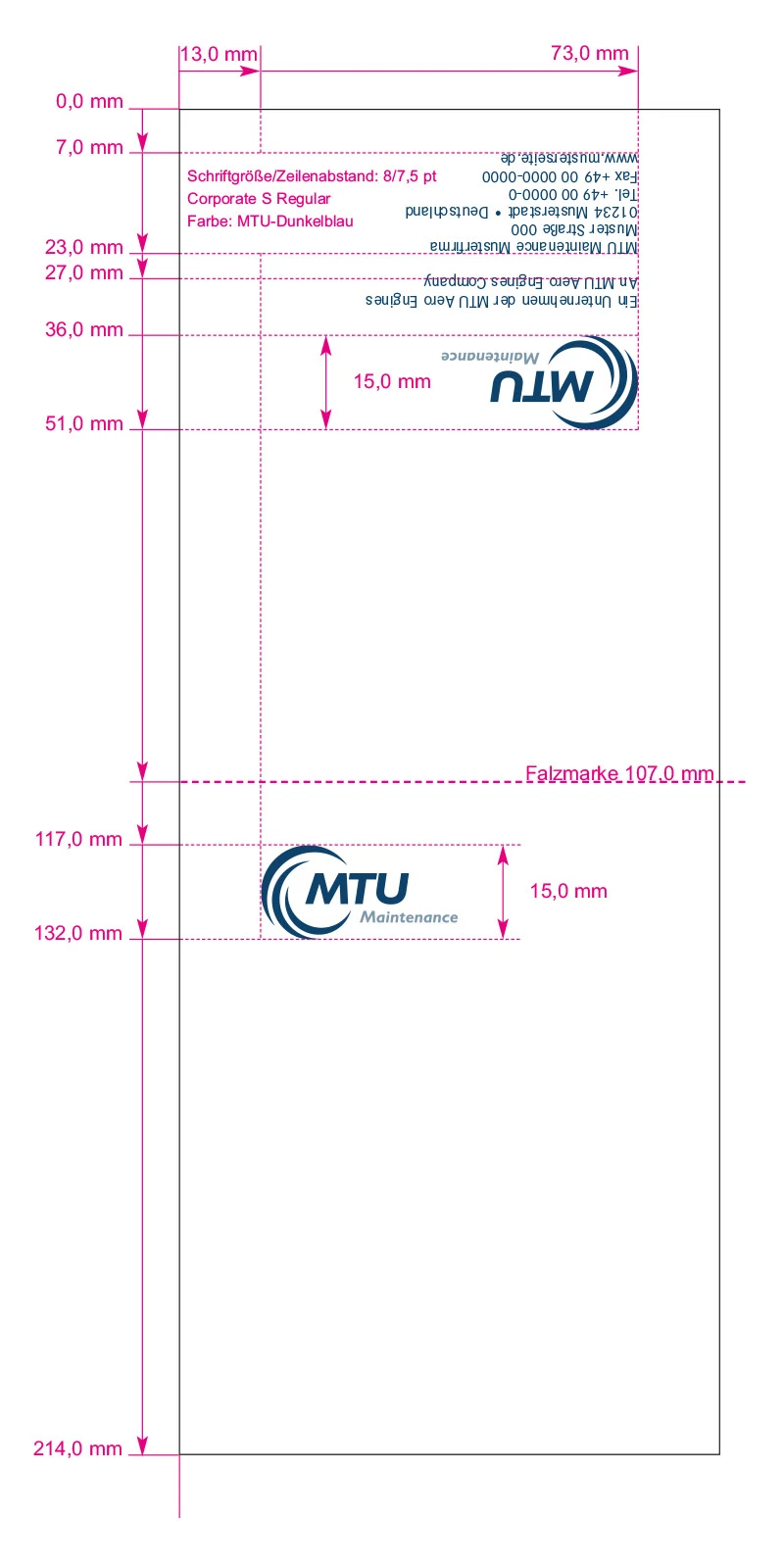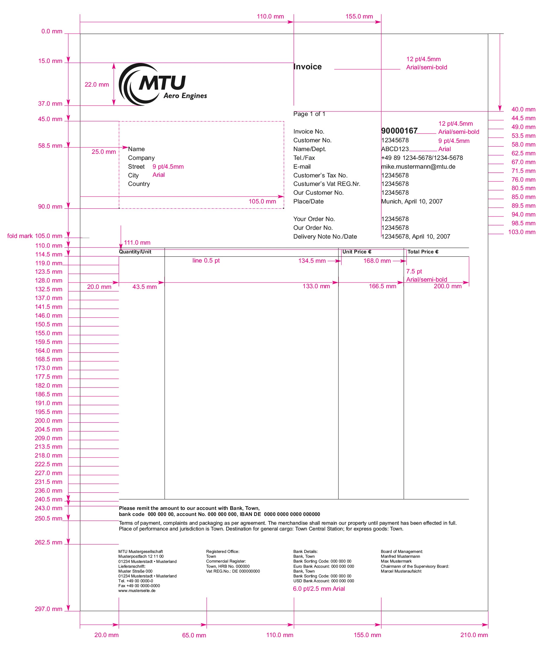 in ÜberarbeitungGeschäftspapiere sind ein wesentlicher Bestandteil unserer Kommunikation, da diese weit verbreitet und häufig eingesetzt werden. Durch das Layout unserer Geschäftspapiere wird ein bestimmtes, von der MTU Aero Engines beabsichtigtes Image kommuniziert. Genauso wichtig ist jedoch der Inhalt, der von jedem Einzelnen in einen Brief, eine Mitteilung oder ein Formular eingebracht wird sowie der Zustand der Geschäftspapiere, wenn sie den Empfänger erreichen. Schlecht formulierte Schreiben oder nachlässig gefaltete Briefbogen beeinträchtigen den Eindruck der Präzision und Effizienz, den wir vermitteln wollen. Der beste Eindruck entsteht aus der Summe aller korrekt eingesetzten Details.