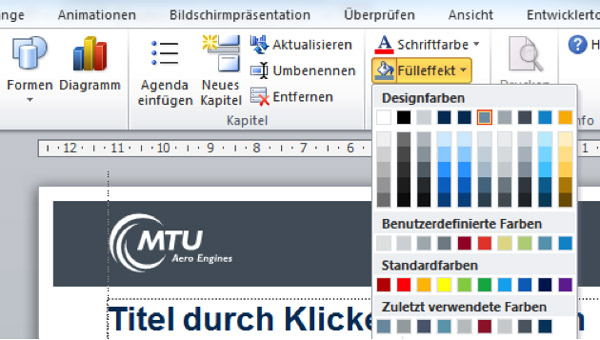 Die Vorlagen entsprechen in ihrer Farbgebung und ihrem Stil den Gestaltungsrichtlinien der MTU. Setzen Sie bei Bedarf möglichst hochwertige Bilder ein. Achten Sie bei der Umsetzung von Charts und Tabellen auf eine klare Darstellung und verwenden Sie nur Farben aus der MTU-Skala. Halten Sie sich an die Randvorgaben und die Schriftgröße. Denn nur durch die Einhaltung dieser Vorgaben kann ein einheitlicher Auftritt der MTU – nach außen und innen – gewährleistet werden.