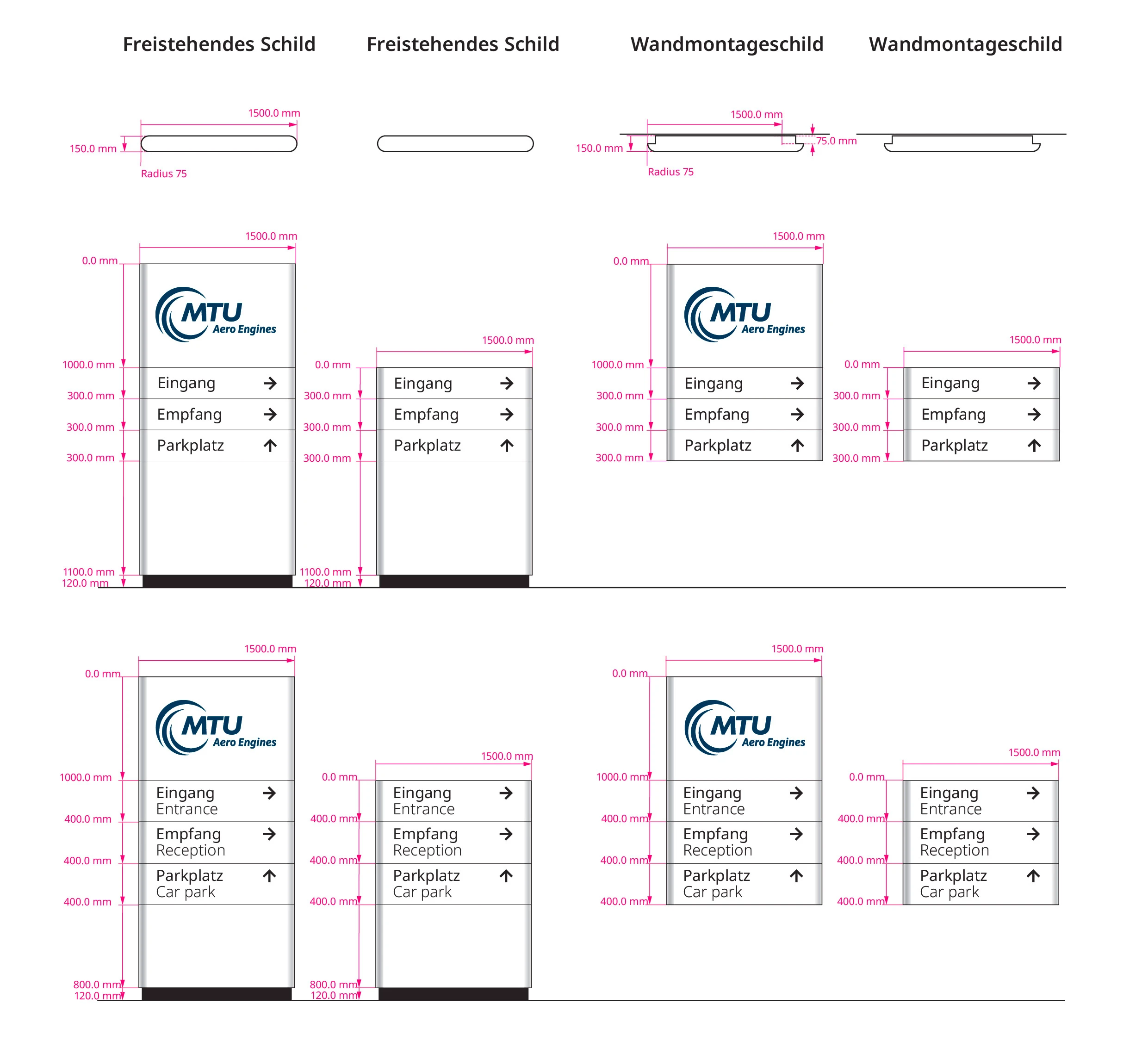 An den Hauptgebäuden unserer Standorte verwenden wir große Identifikationsschilder zur Wandmontage.