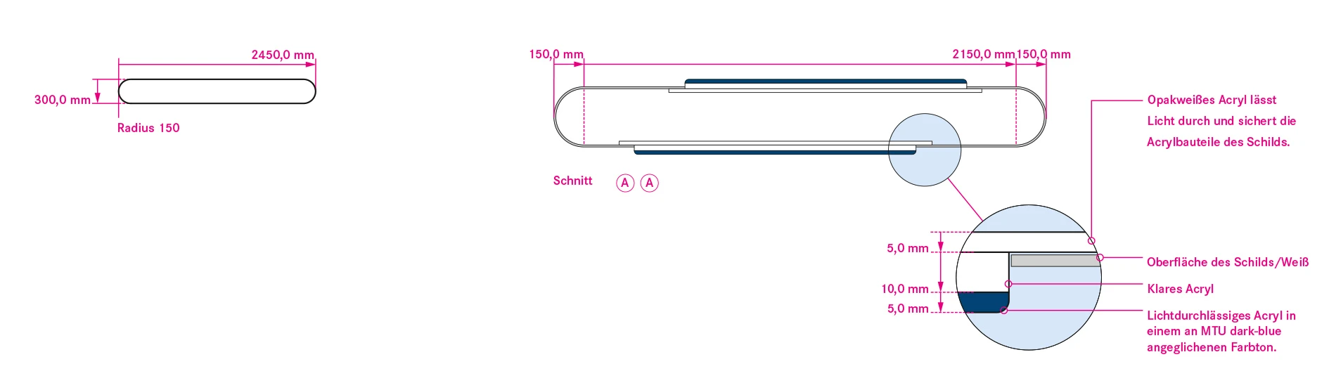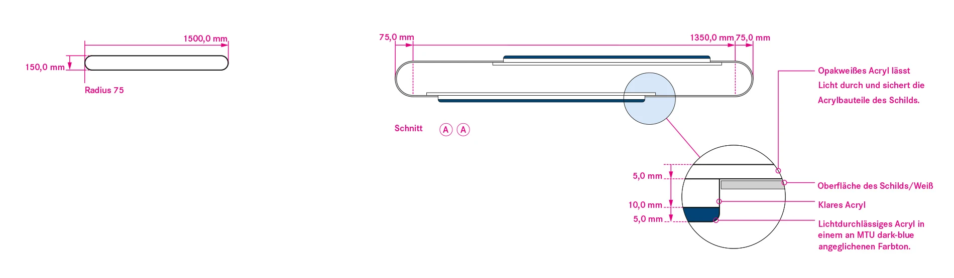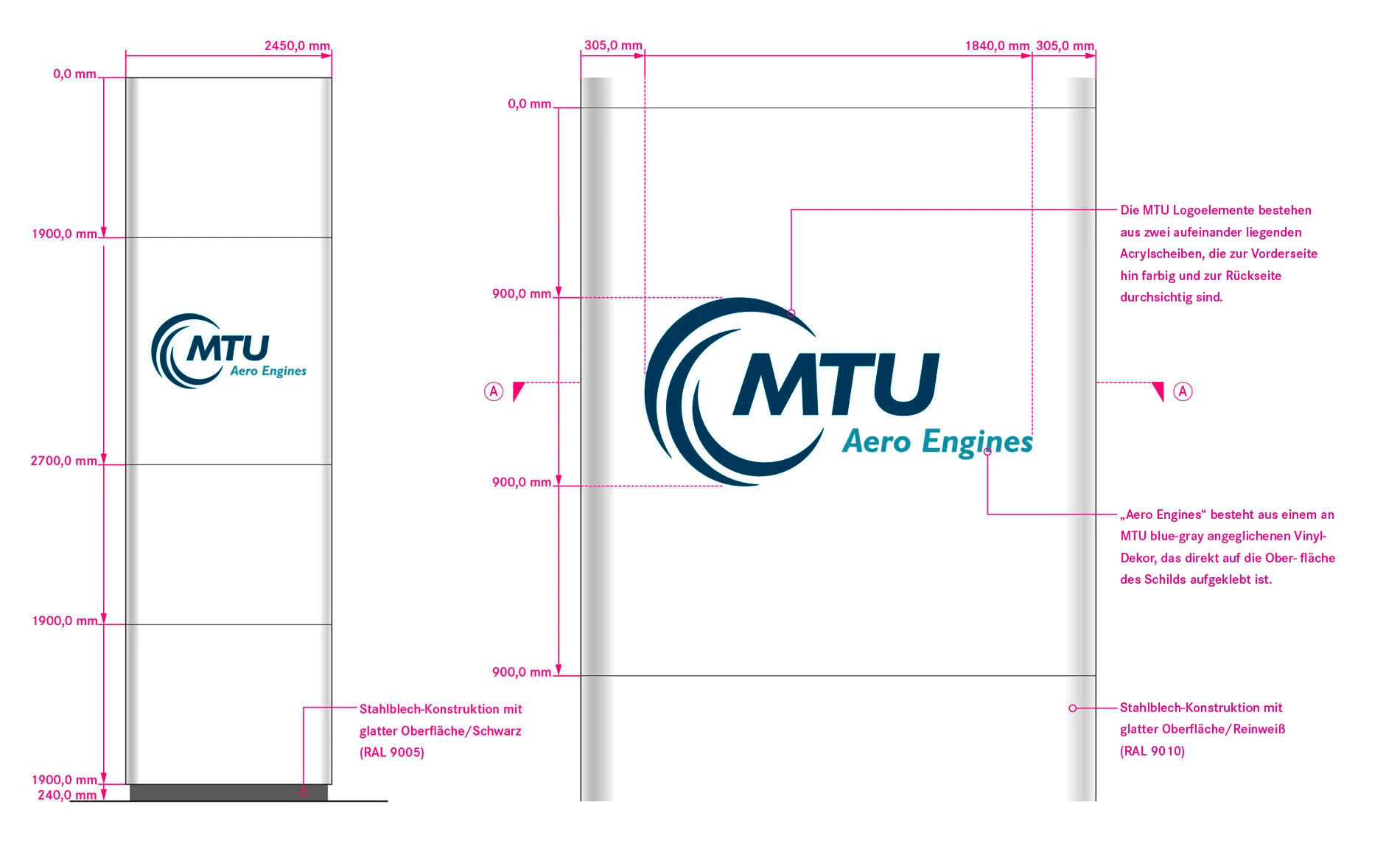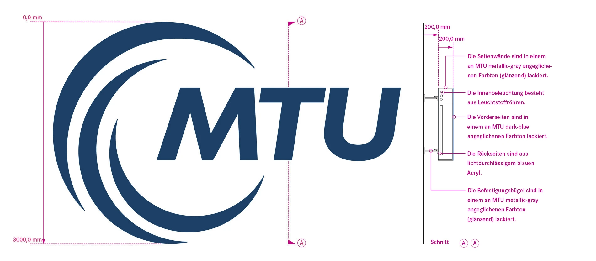 Die Vorderseite und die Seitenwände der Logoelemente sind aus Aluminium, die Rückseite aus lichtdurchlässigem blauen Acryl. Die Vorderseite der Logoelemente ist nicht beleuchtet und in einem an das MTU dark-blue angeglichenen Farbton lackiert. Die Seitenwände sind ebenfalls nicht beleuchtet und in einem an MTU metallic-gray angeglichenen Farbton (glänzend) lackiert. Durch die Innenbeleuchtung fällt Licht durch die Rückseite der Logoelemente. Befestigungsbügel halten die gesamte Konstruktion auf Abstand zum Gebäude, so dass blaues Licht über den Rand der Logoelemente fällt und gleichzeitig auf das Gebäude zurückstrahlt.
