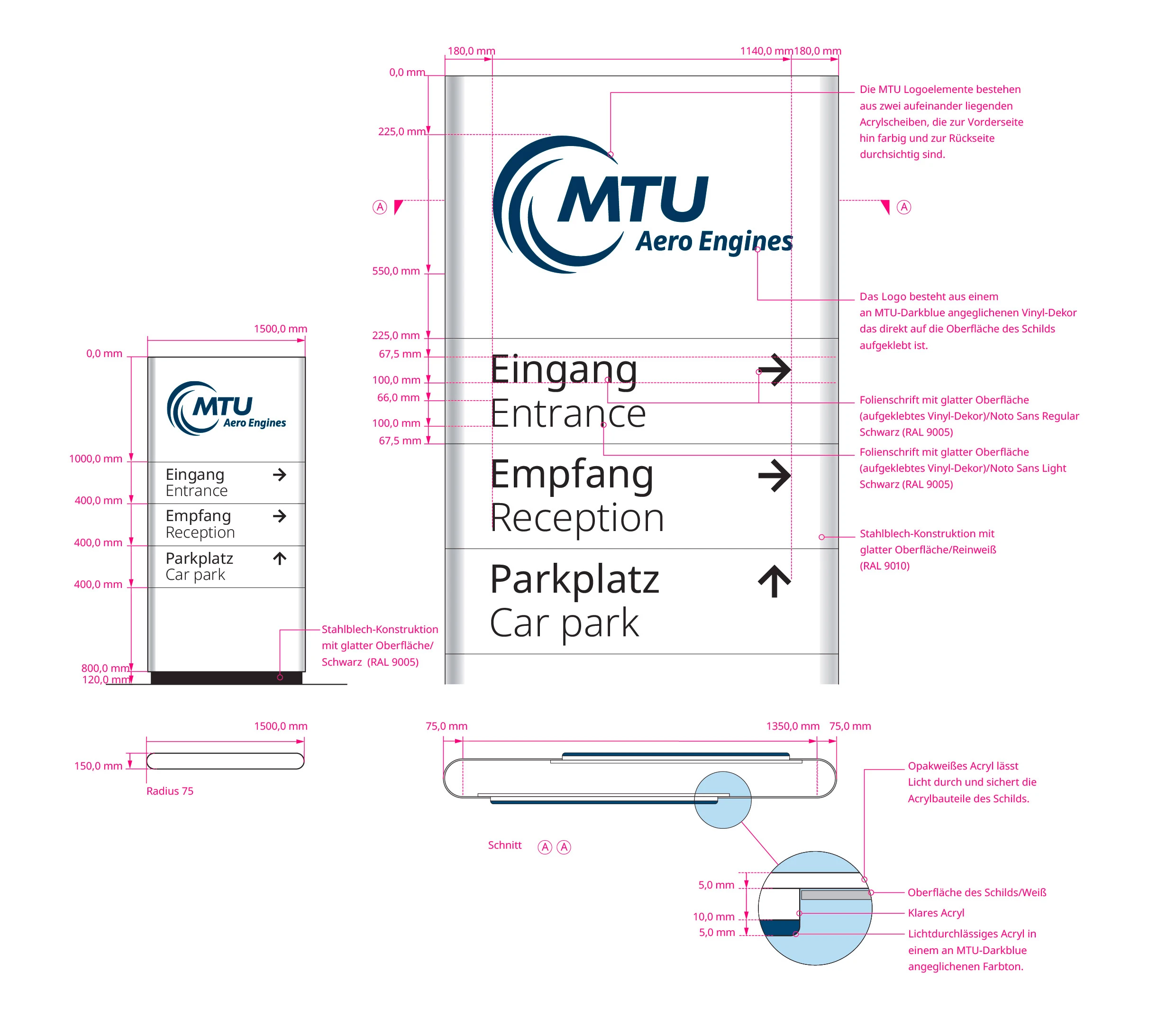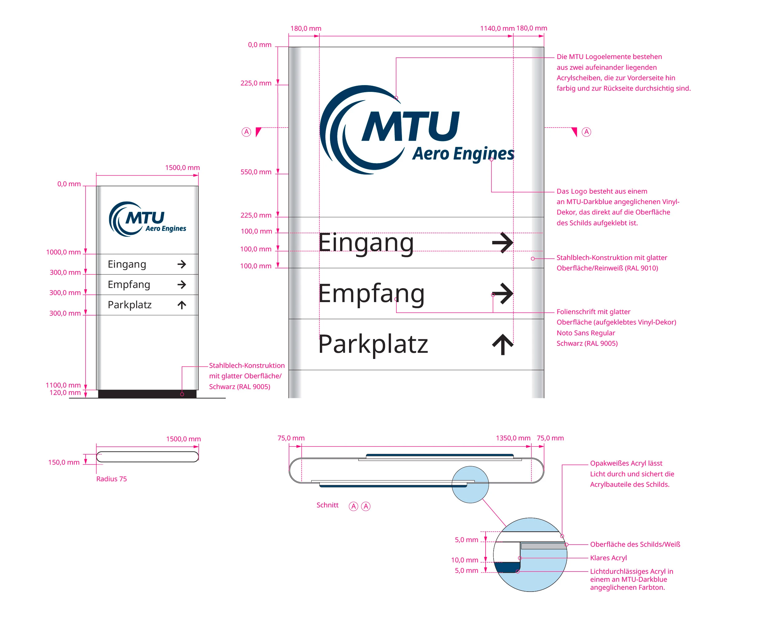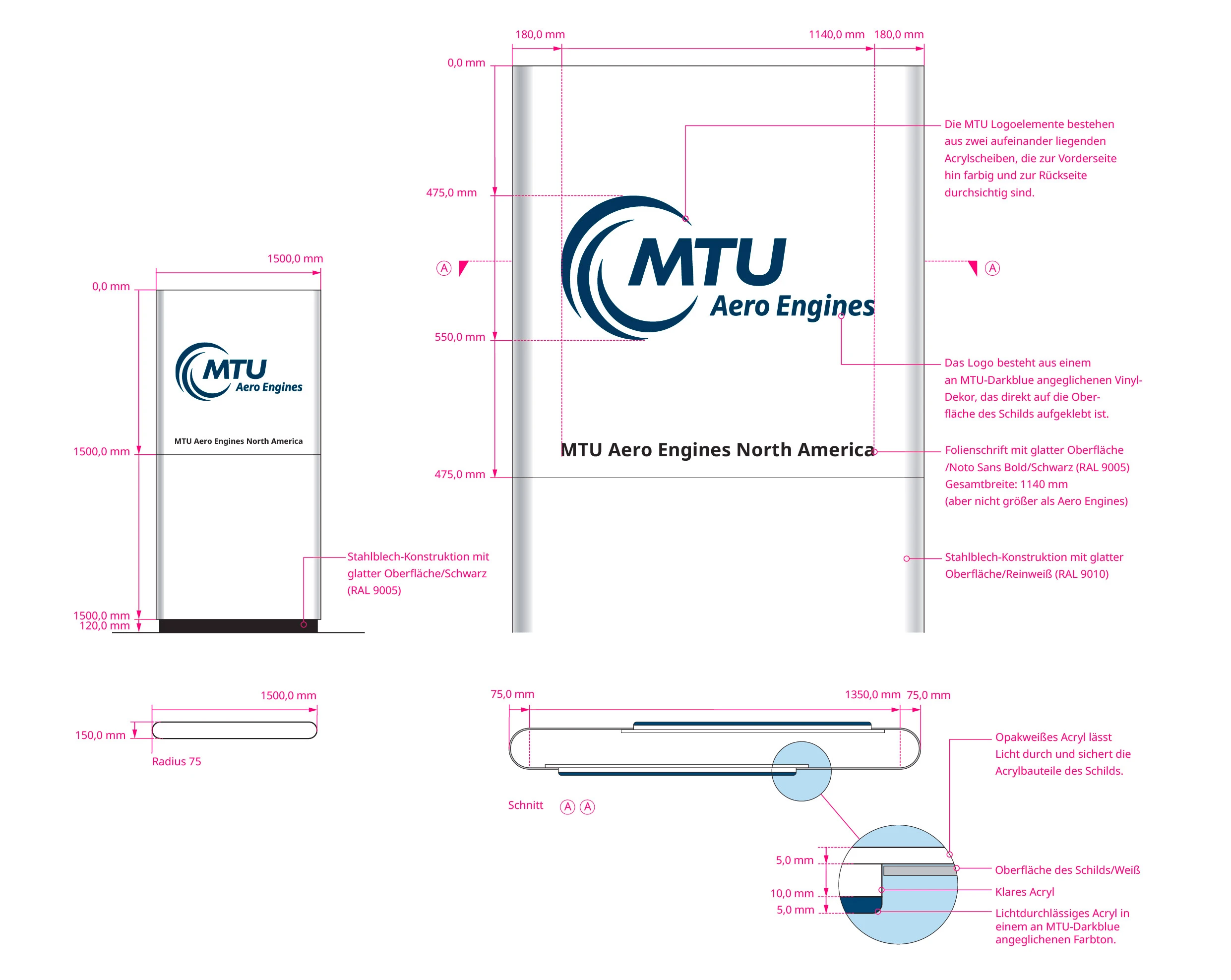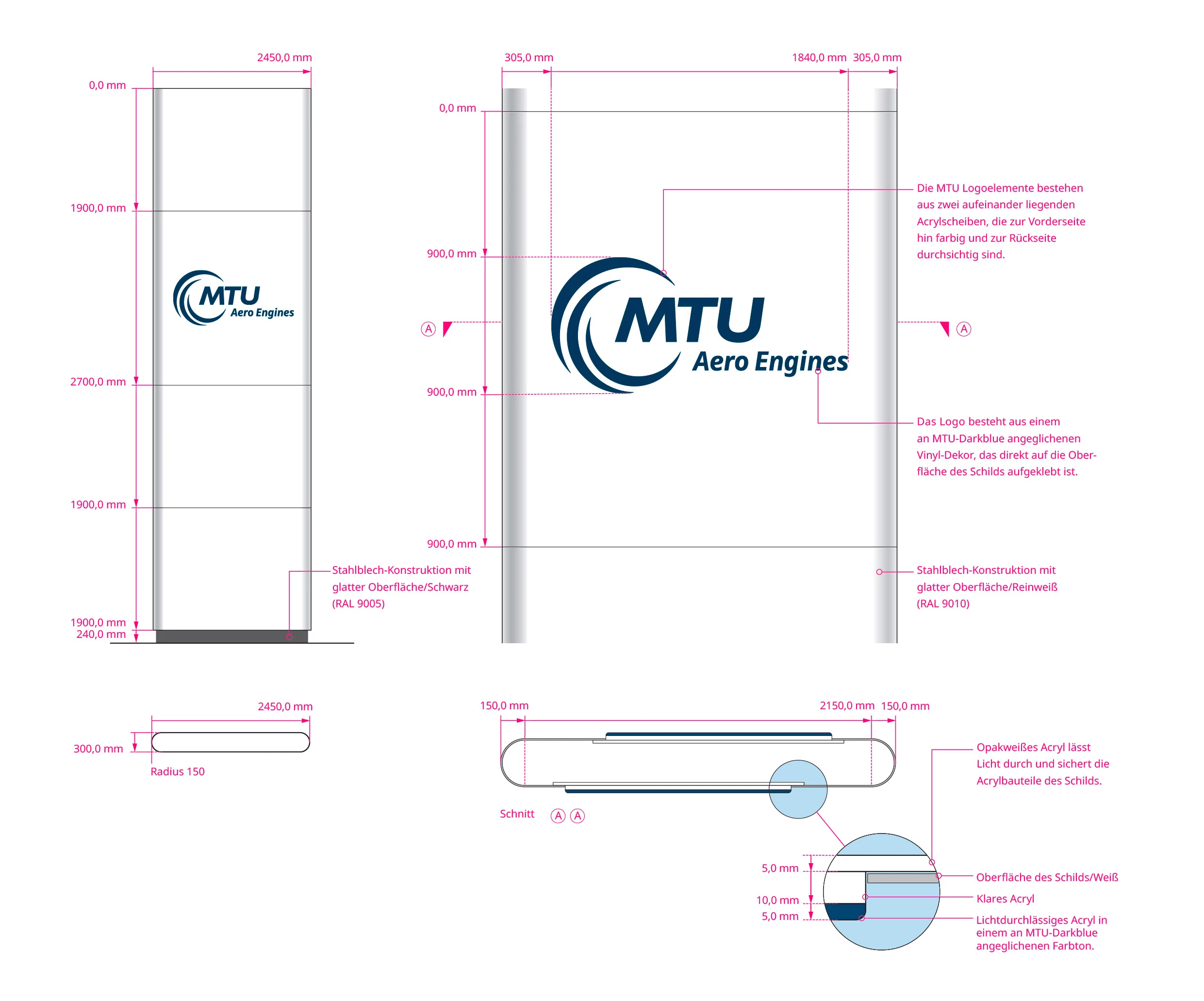 Die Vorderseite und die Seitenwände der Logoelemente sind aus Aluminium, die Rückseite aus lichtdurchlässigem blauen Acryl. Die Vorderseite der Logoelemente ist nicht beleuchtet und in einem an das MTUDarkblue angeglichenen Farbton lackiert. Die Seitenwände sind ebenfalls nicht beleuchtet und in einem an MTU metallic-gray angeglichenen Farbton (glänzend) lackiert. Durch die Innenbeleuchtung fällt Licht durch die Rückseite der Logoelemente. Befestigungsbügel halten die gesamte Konstruktion auf Abstand zum Gebäude, so dass blaues Licht über den Rand der Logoelemente fällt und gleichzeitig auf das Gebäude zurückstrahlt.
