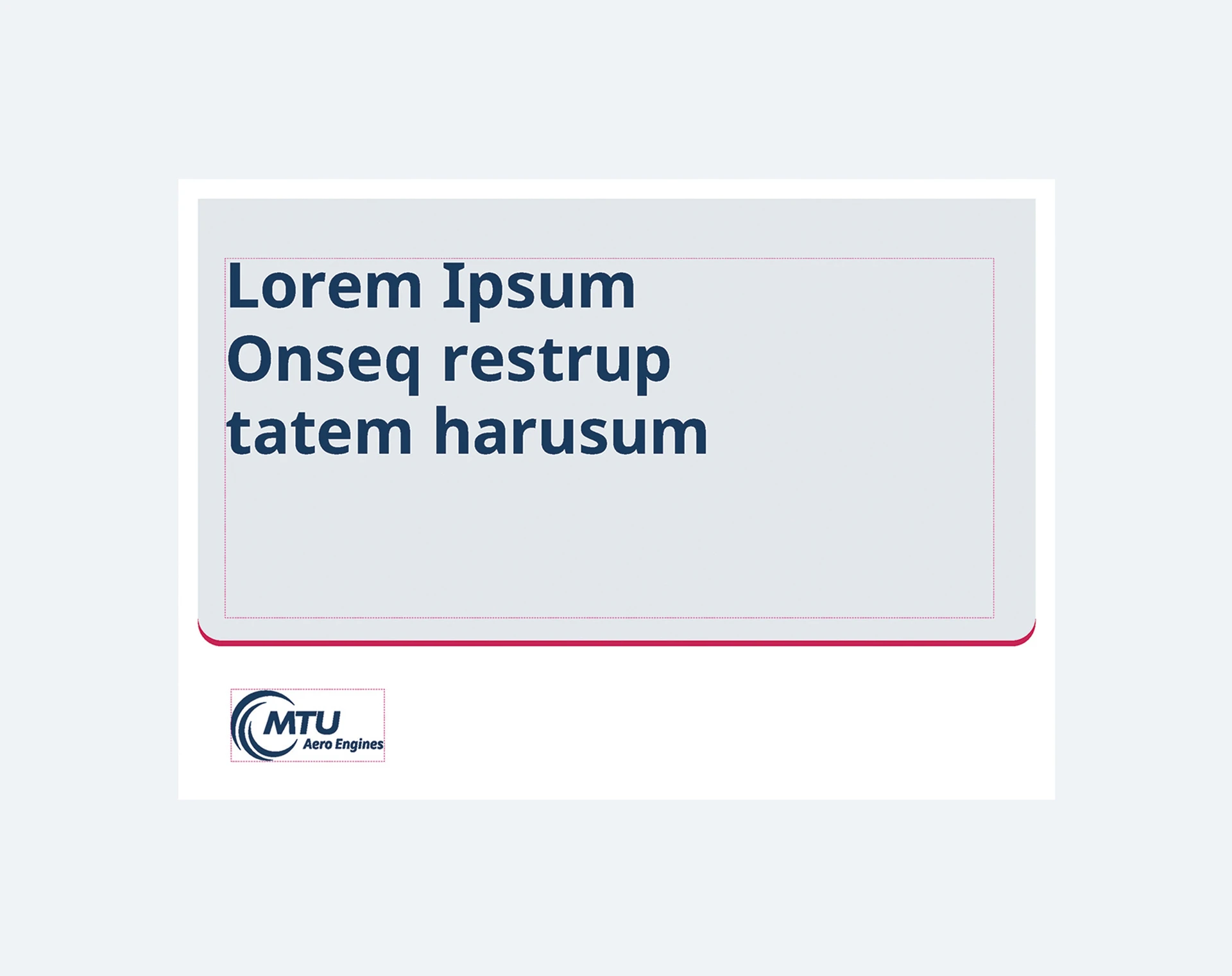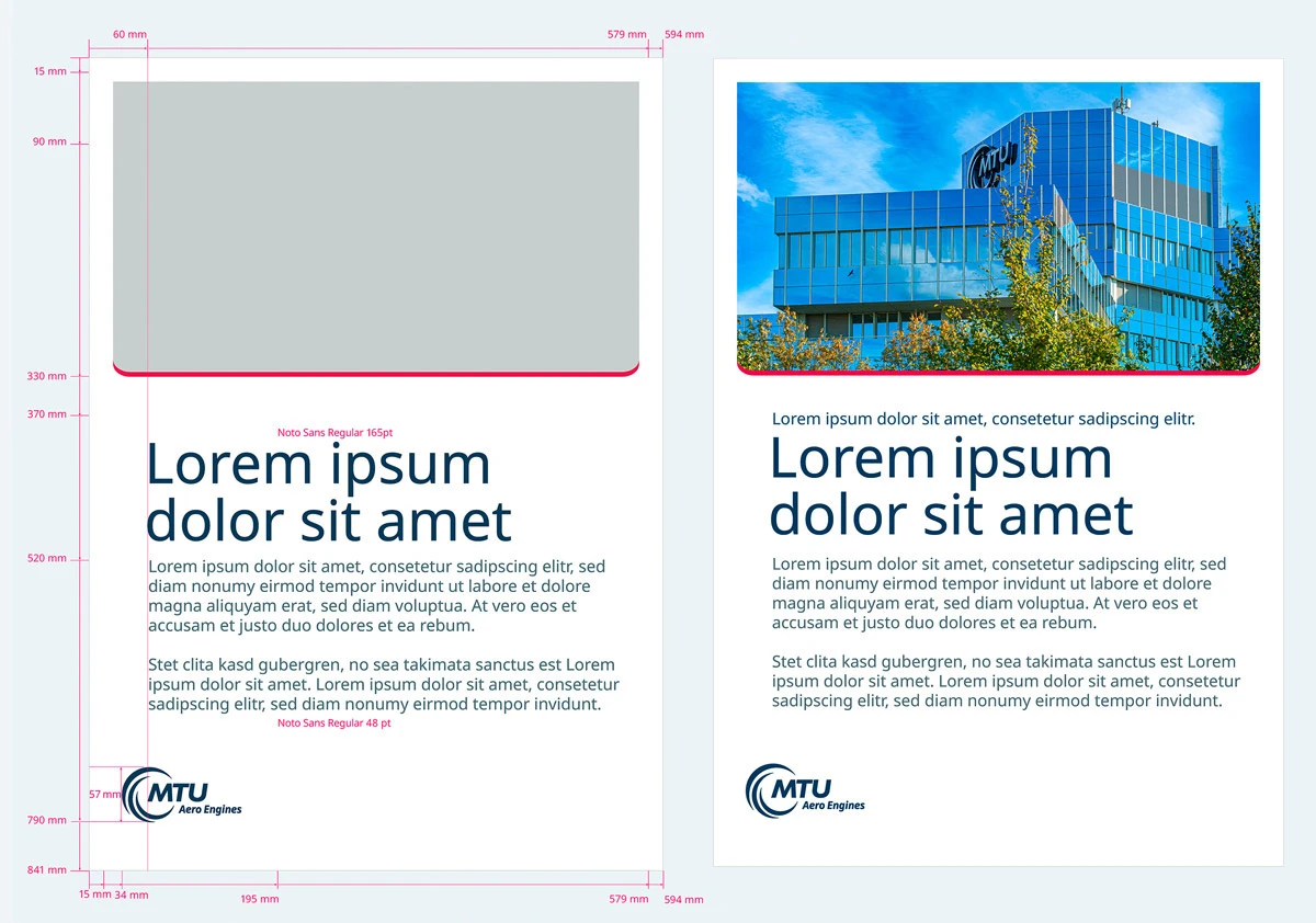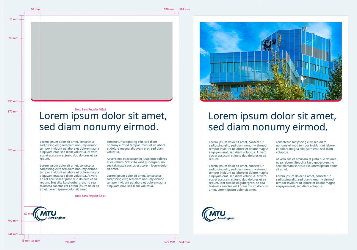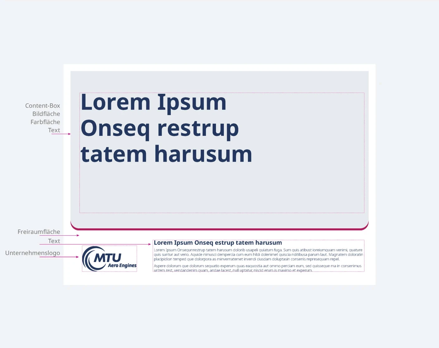 Die Content-Box ist die Bühne für das zu transportierende Thema. Darstellung und Gestaltung ist relativ frei, um den einzelnen Anforderungen gerecht zu werden. Die Basis-Vorgaben des MTU Corporate Designs müssen jedoch eingehalten werden. Möglich sind hier Darstellungen von Bildmaterial, Farbflächen und überlagernden Texten z. B. in Form von größeren und gut lesbaren Headlines. Die Content-Box ist dabei so zu gestalten, dass sie sich optisch gut vom Untergrund abgrenzt.
