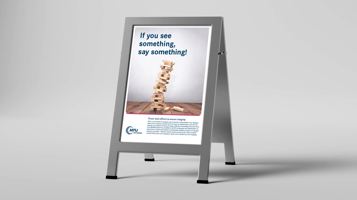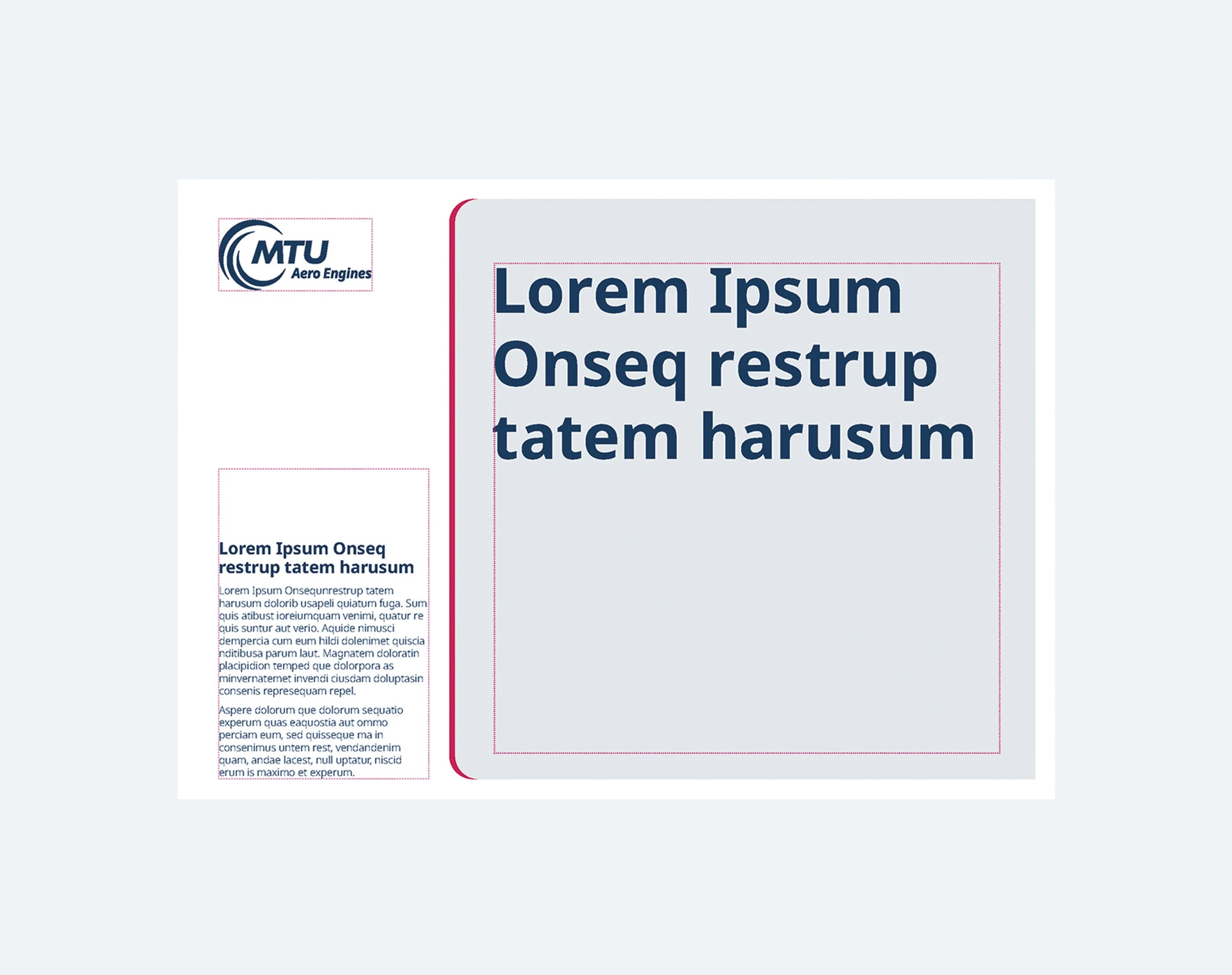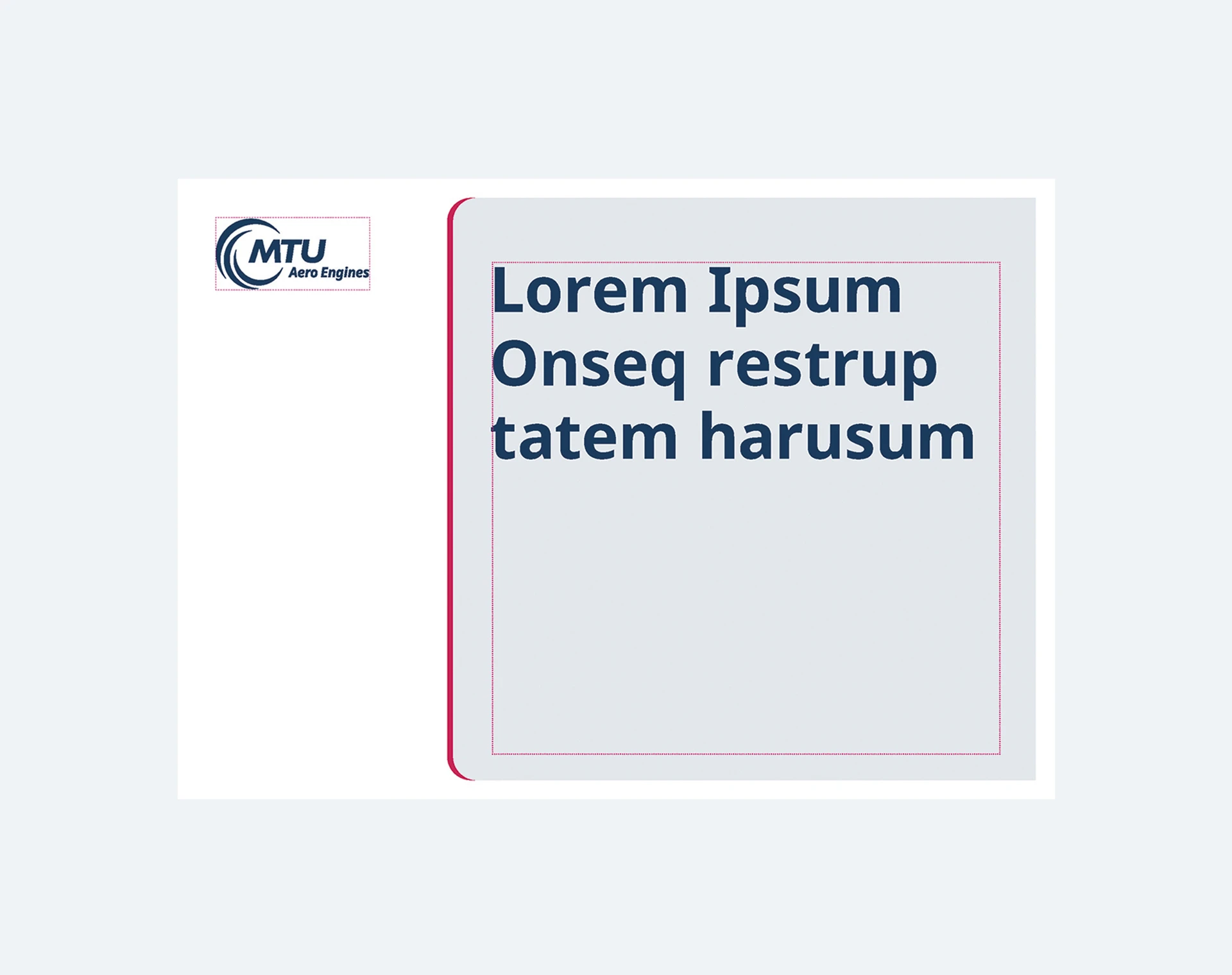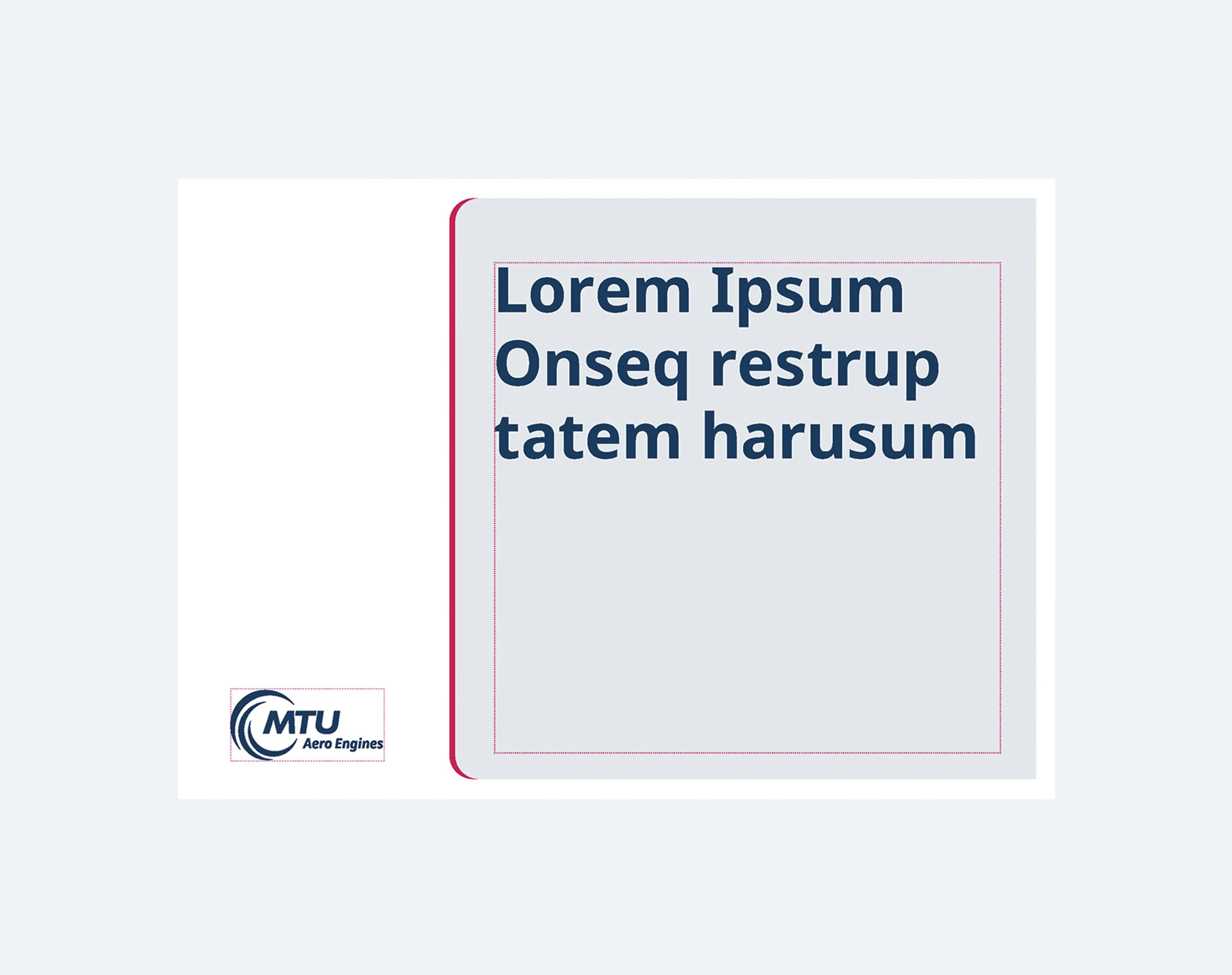 Die Content-Box ist die Bühne für das zu transportierende Thema. Darstellung und Gestaltung ist relativ frei, um den einzelnen Anforderungen gerecht zu werden. Die Basis-Vorgaben des MTU Corporate Designs müssen jedoch eingehalten werden. Möglich sind hier Darstellungen von Bildmaterial, Farbflächen und überlagernden Texten z. B. in Form von größeren und gut lesbaren Headlines. Die Content-Box ist dabei so zu gestalten, dass sie sich optisch gut vom Untergrund abgrenzt.