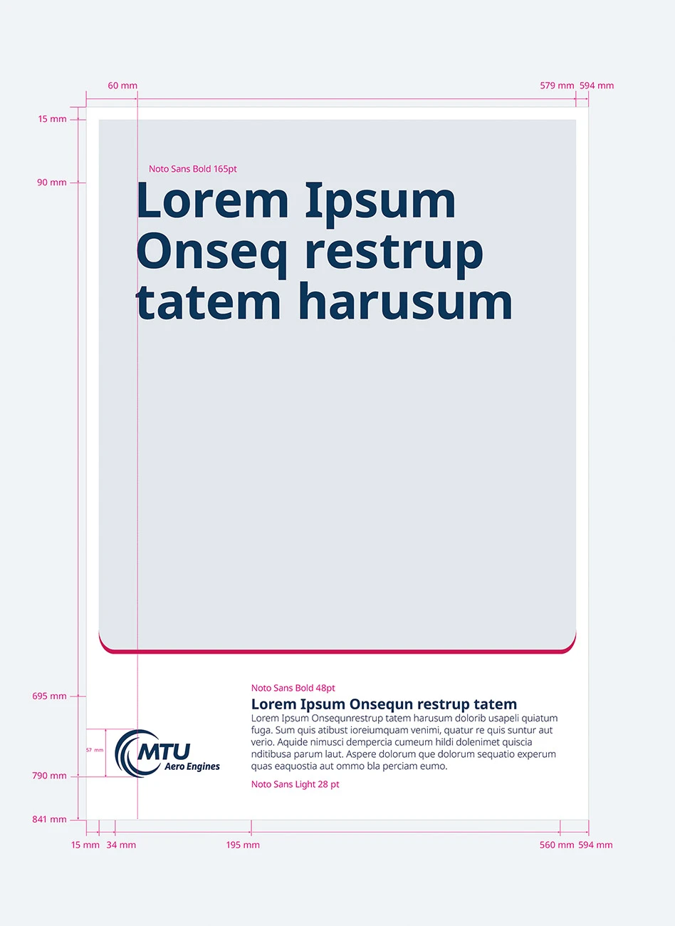 Die Freiraumfläche besitzt als Vorgabe grundsätzlich einen weißen Hintergrund und beinhaltet als wichtigstes Element das MTU Unternehmenslogo. Zusätzlich besteht die Möglichkeit zur Abbildung weiterführende Texte, Abbinder mit URLs, Social-Media Icons etc...