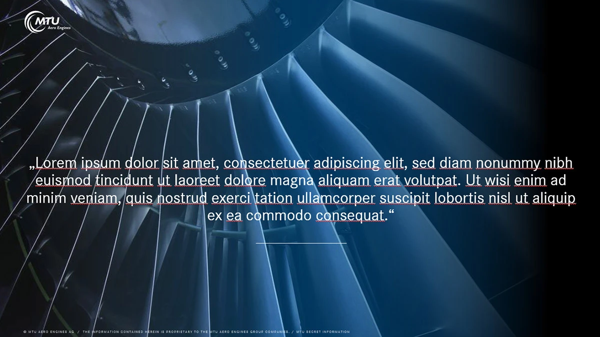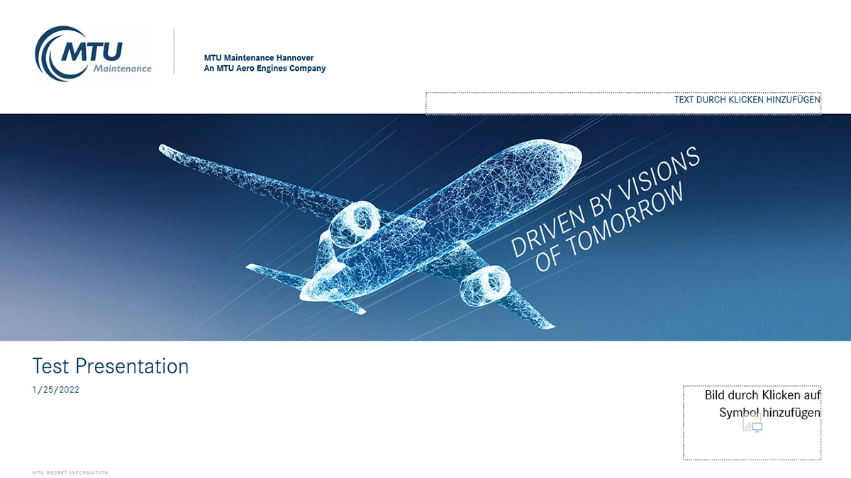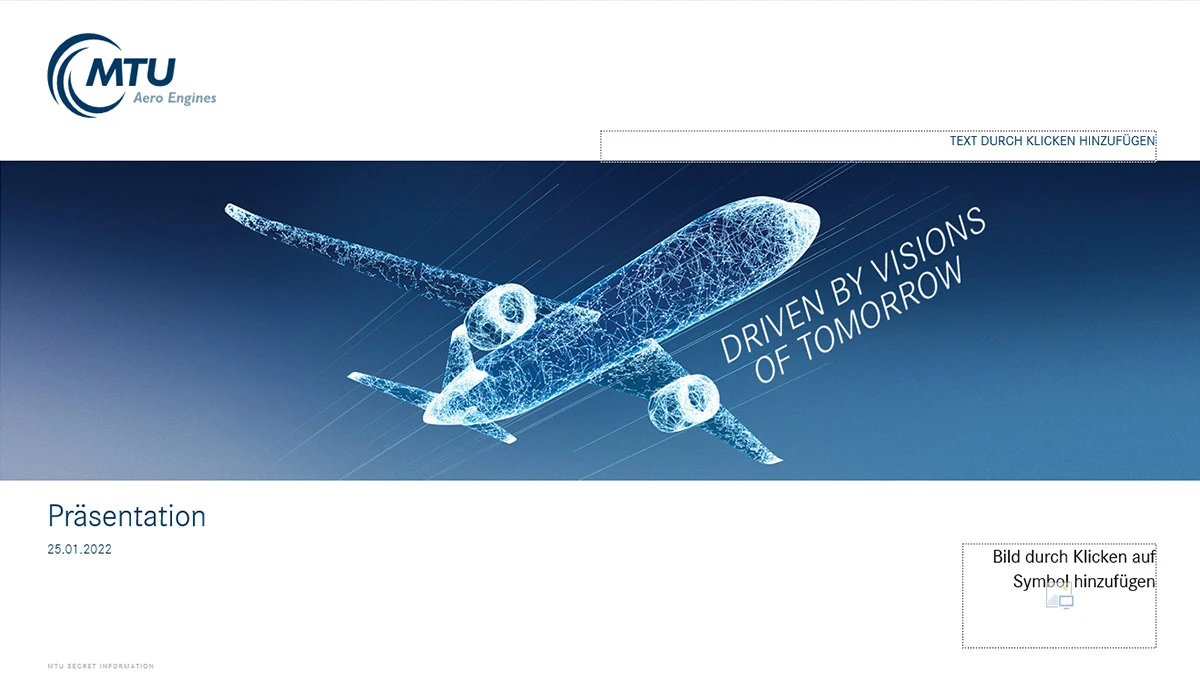 The Presentation Assistant is an essential part of the MTU templates as part of the corporate design guidelines and must be used both externally and internally for the presentations. This ensures that MTU has a uniform appearance.