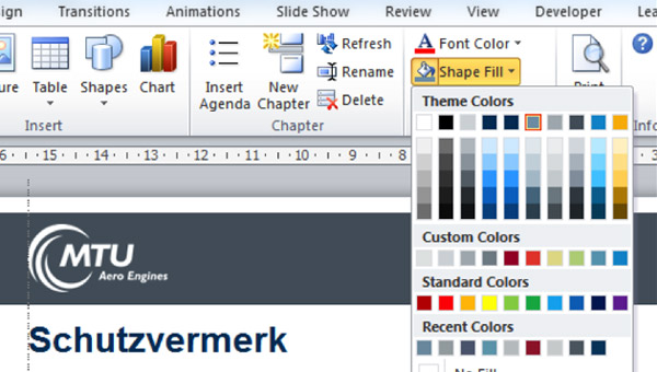 If you need pictures, try to make sure the image quality is as high as possible. When your presentation includes charts and tables, ensure that they are displayed clearly and choose only colors from the MTU scale. Stick to the margin specifications and the font size. Only by observing these requirements can we ensure that we always present MTU in a standardized, professional light – both within the company and to the outside world.