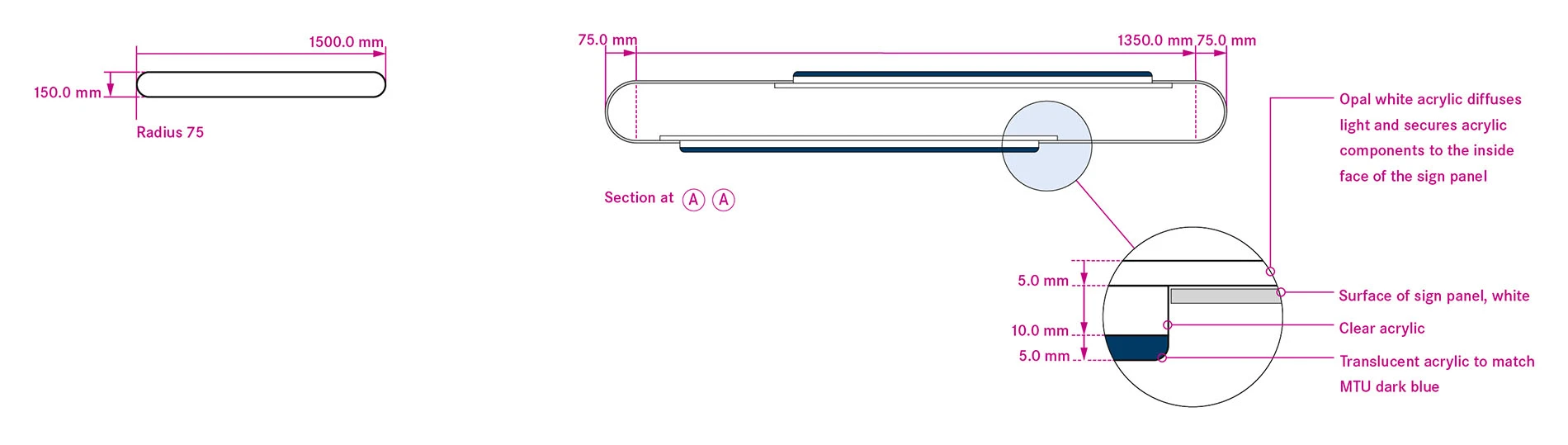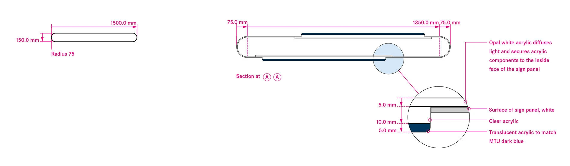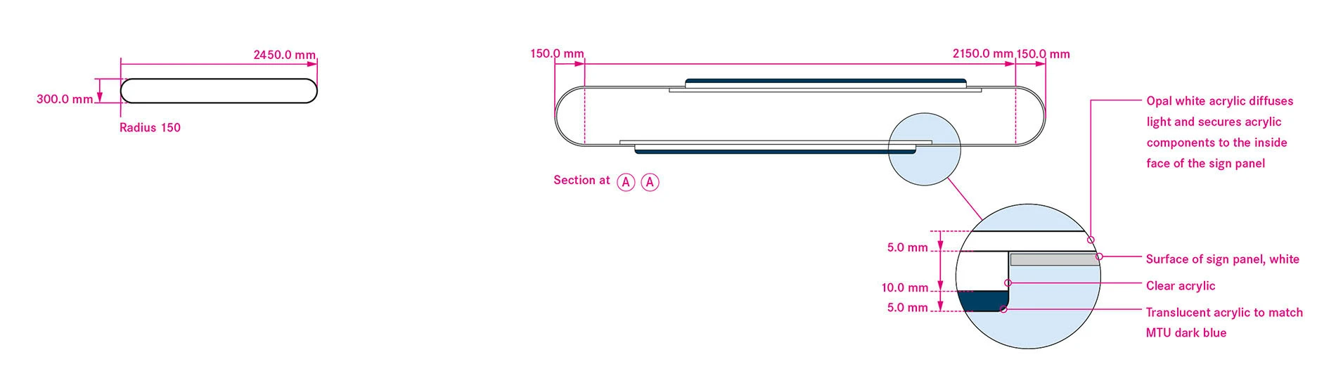 The face and the side returns of the identity elements are made of aluminum with the back side being a translucent blue acrylic. The faces of the identity elements do not light up and are painted MTU dark blue. The side returns also do not light up and are painted MTU metallic gray (gloss finish). Internal illumination, however, emits light through the back sides of the identity elements, and because support brackets lift the whole arrangement away from the building itself, the emitted light casts a blue halo around the edge of the identity elements and also reflects back on to the surface of the building.
